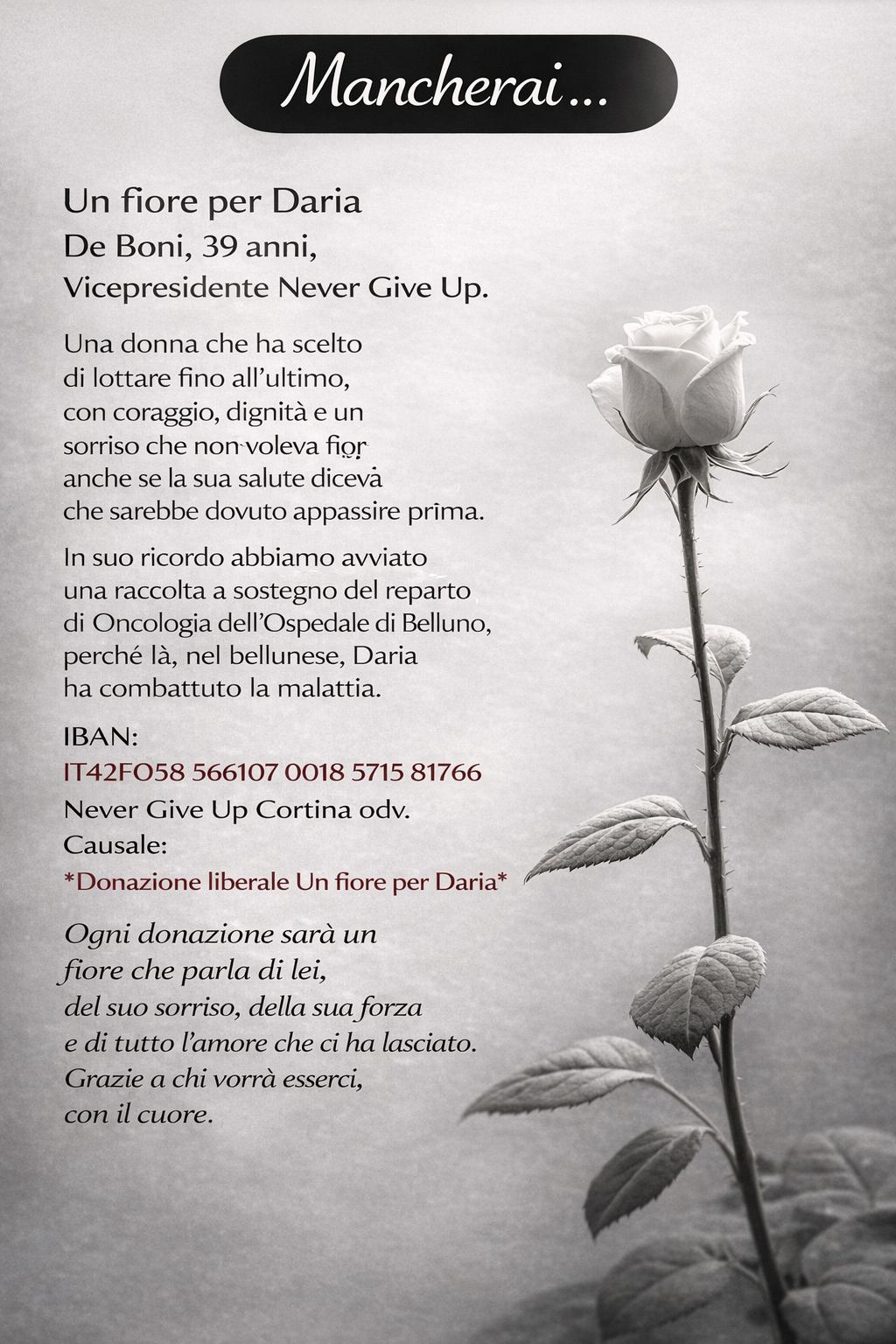 CORTINA piange Daria De Boni, morta a 39 anni all’ospedale Giovanni Paolo II di Pieve di Cadore. Vicepresidente dell’associazione Never give up, era molto conosciuta per il suo impegno nel volontariato contro i tumori. Nonostante la malattia, non aveva mai perso il sorriso e aveva continuato a dedicarsi agli altri con energia e idee. Grande appassionata di montagna e sport, era un punto di riferimento per la comunità. Oggi i funerali in basilica. In sua memoria è stata avviata una raccolta fondi a sostegno dell’Oncologia di Belluno.