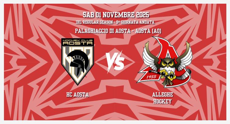HC AOSTA – ALLEGHE HOCKEY Sabato 1º Novembre ore 20:00 – Palaghiaccio di Aosta. Arbitri: Simone Vignolo e Willy Vinicio Volcan con giudici di linea Thomas Brida e Davide Picco. Collegamenti in DIRETTA RADIOFONICA su Radio Più (www.radiopiu.net) con “hockey al punto giusto”, in studio Marco Gaz e da Aosta interventi di Roberto Miana.