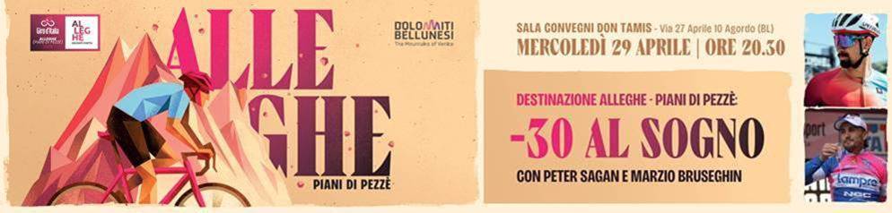 ALLEGHE Alleghe si prepara all’arrivo del Giro d’Italia, e il 29 aprile accoglie in uno speciale talk show due giganti del ciclismo: Peter Sagan e Marzio Bruseghin. Dalle 20.30 i due saliranno sul palco della Sala Convegni Don Tamis di Agordo per raccontarsi tra aneddoti, curiosità e retroscena, in una serata moderata dal giornalista Ilario Tancon. Maggio si avvicina e manca sempre meno alla partenza del 109esimo Giro d’Italia. L’entusiasmo per la corsa rosa cresce di giorno in giorno e lo stesso vale per il paese di Alleghe, che il 29 maggio ospiterà ai Piani di Pezzè il traguardo di un’attesissima e determinante 19.a tappa del Giro 2026. L’appuntamento è storico, e per l’occasione il Comitato di Tappa di Alleghe ha messo in calendario una serie di eventi che consentiranno di entrare nell’atmosfera unica di quella che sarà una giornata indimenticabile. Il 29 aprile, ad un mese esatto dall’atteso arrivo del Giro d’Italia ai Piani di Pezzè, Alleghe lancia il proprio countdown proponendo una serata speciale dedicata agli appassionati di ciclismo ma anche ai semplici curiosi. Sul palco della sala convegni Don Tamis saliranno due atleti che hanno scritto la storia recente delle corse su strada: Peter Sagan non ha bisogno di presentazioni, l’ex ciclista slovacco vanta più di 100 vittorie in carriera ed è stato l’unico capace di conquistare tre titoli mondiali consecutivi. Tre sono anche le sue partecipazioni ai Giochi Olimpici, mentre ben 12 le vittorie di tappa al Tour de France, successi che gli valsero il soprannome di “Tourminator”. Il fuoriclasse nato a Žilina ha lasciato il segno anche al Giro d’Italia nel 2020 e nel 2021, ottenendo una vittoria di tappa in ciascuna edizione e vincendo la maglia ciclamino come vincitore della classifica a punti nel 2021. Al suo fianco ci sarà tutta l’esperienza di Marzio Bruseghin, professionista dal 1997 al 2012, anni in cui il trevigiano si levò numerose soddisfazioni diventando campione italiano a cronometro, ottenendo la maglia azzurra in sette Mondiali e concludendo sul podio finale del Giro d’Italia 2008. Proprio nel 2008 fu convocato sia per la prova in linea che per la cronometro ai Giochi Olimpici di Pechino. I preparativi per la serata sono stati ultimati. La moderazione del talk show è affidata al giornalista Ilario Tancon, che guiderà il racconto di queste due grandi personalità del ciclismo, oltre a snocciolare le emozioni di una carovana rosa che torna ad Alleghe e ai Piani di Pezzè. Il Giro d’Italia 2026 prende il via l’8 maggio da Nessebar, in Bulgaria e approda in Italia il 12 maggio. Un totale di 3.466 km attendono la carovana rosa, che giungerà ad Alleghe ai Piani di Pezzè il 29 maggio, per una tappa interamente bellunese che si estende per ben 151 km e 5.000 metri di dislivello. Oltre al talk del 29 aprile, il countdown di Alleghe verso il Giro non si ferma qui e si prepara a mettere in scena una serie di appuntamenti e concorsi che scandiranno il ritmo a tinte rosa fino a fine maggio.