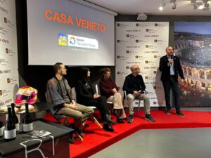 Incontri realizzati nell’ambito del palcoscenico offerto da Casa Veneto, come “Dolomiti Bellunesi: storie fuori dai luoghi comuni”, hanno dato spazio a realtà d’eccellenza che uniscono radicamento territoriale e capacità innovativa. Plastoptic di Dosoledo ha presentato i Dolomini, riproduzioni in miniatura delle cime dolomitiche trasformate in oggetti di design contemporaneo, mentre Farben1962, storica azienda di occhialeria del Cadore, ha illustrato un modello produttivo fondato sulla lavorazione manuale e sull’uso di materiali naturali come il legno di cirmolo e la vinaccia di Amarone. Dallo studio di Ascari Design Helmet a Gosaldo, la decorazione personalizzata ha trasformato caschi tecnici in elementi espressivi e distintivi. Da Feltre è arrivata anche l’esperienza di Riso Sakè, progetto che unisce la tradizione risicola italiana alla cultura giapponese, con un’attenzione particolare alla qualità e alla sperimentazione.