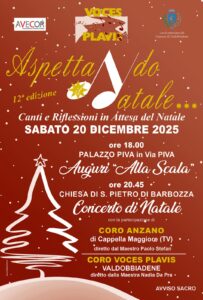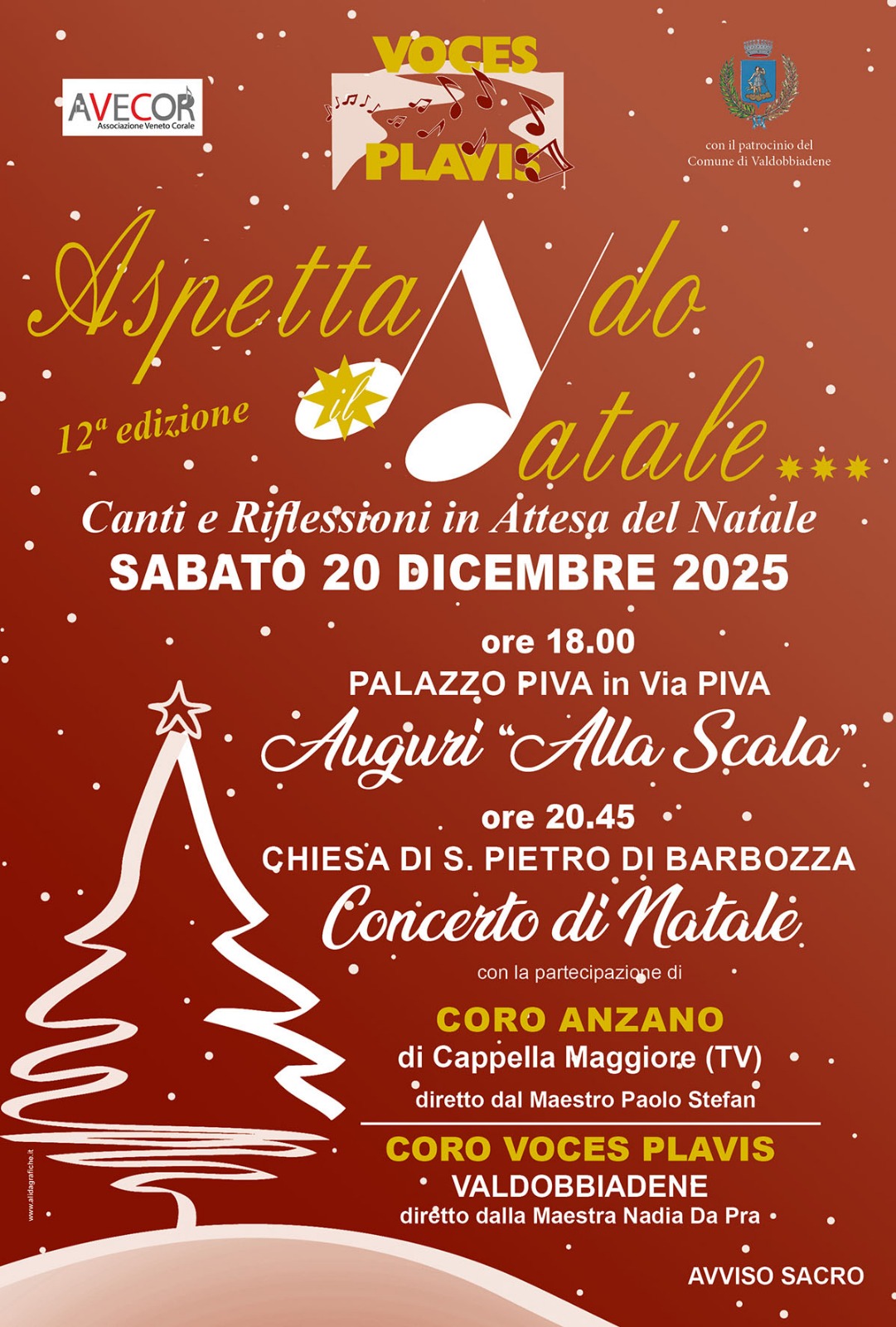 VALDOBBIADENE (TV) Torna a Valdobbiadene l’appuntamento con “Aspettando il Natale”, rassegna corale giunta alla dodicesima edizione e promossa dal Coro Voci Plavis con il patrocinio del Comune. Sabato 20 dicembre 2025 la musica accompagnerà il pubblico in un percorso di canti e riflessioni in attesa delle festività. Il primo momento è in programma alle ore 18 a Palazzo Piva, con l’iniziativa “Auguri alla Scala”, occasione conviviale aperta alla cittadinanza. Alle 20.45 l’evento proseguirà nella chiesa di San Pietro di Barbozza con il tradizionale Concerto di Natale. Sul palco il Coro Anzano di Cappella Maggiore, diretto dal maestro Paolo Stefan, e il Coro Voci Plavis di Valdobbiadene, guidato dalla maestra Nadia Da Pra. Una serata di musica sacra e condivisione.