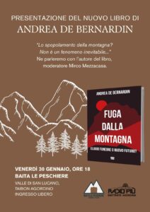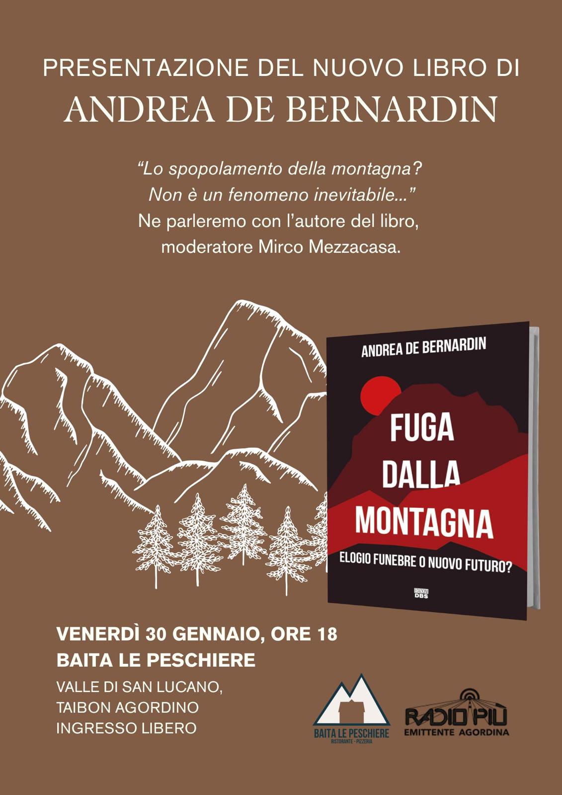 REDAZIONE Domani alle ore 18, presso la Baita Le Peschiere in Valle di San Lucano, a Taibon Agordino, si terrà la presentazione del nuovo libro di Andrea De Bernardin Fuga dalla montagna. Elogio funebre o nuovo futuro?. Un appuntamento aperto al pubblico, a ingresso libero, che invita a riflettere su uno dei temi più urgenti e spesso dati per scontati: lo spopolamento delle aree montane. Il volume affronta con sguardo critico e documentato l’idea che l’abbandono della montagna sia un fenomeno inevitabile. De Bernardin propone invece una lettura alternativa, fatta di domande scomode, responsabilità collettive e possibili scenari futuri. A dialogare con l’autore sarà Mirco Mezzacasa, che guiderà il confronto con il pubblico, stimolando un dibattito aperto e partecipato. L’incontro rappresenta un’occasione preziosa per pensare la montagna non come un luogo del passato, ma come uno spazio vivo, capace di reinventarsi e offrire nuove prospettive.