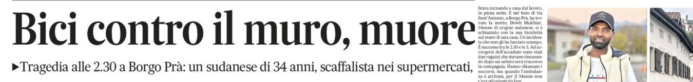 Stava tornando a casa dopo il turno di lavoro, come tante altre volte. In bicicletta, nella notte, lungo le strade di Belluno. Ma quel rientro si è trasformato in tragedia. Mukhtar Dowh, 34 anni, di origine sudanese, ha perso la vita schiantandosi contro il muro di un’abitazione lungo la discesa di via Sant’Antonio, a Borgo Prà. Un impatto violentissimo che non gli ha lasciato scampo. Il corpo è stato trovato nelle prime ore del mattino da due ragazzi che stavano rientrando a casa dopo la serata.