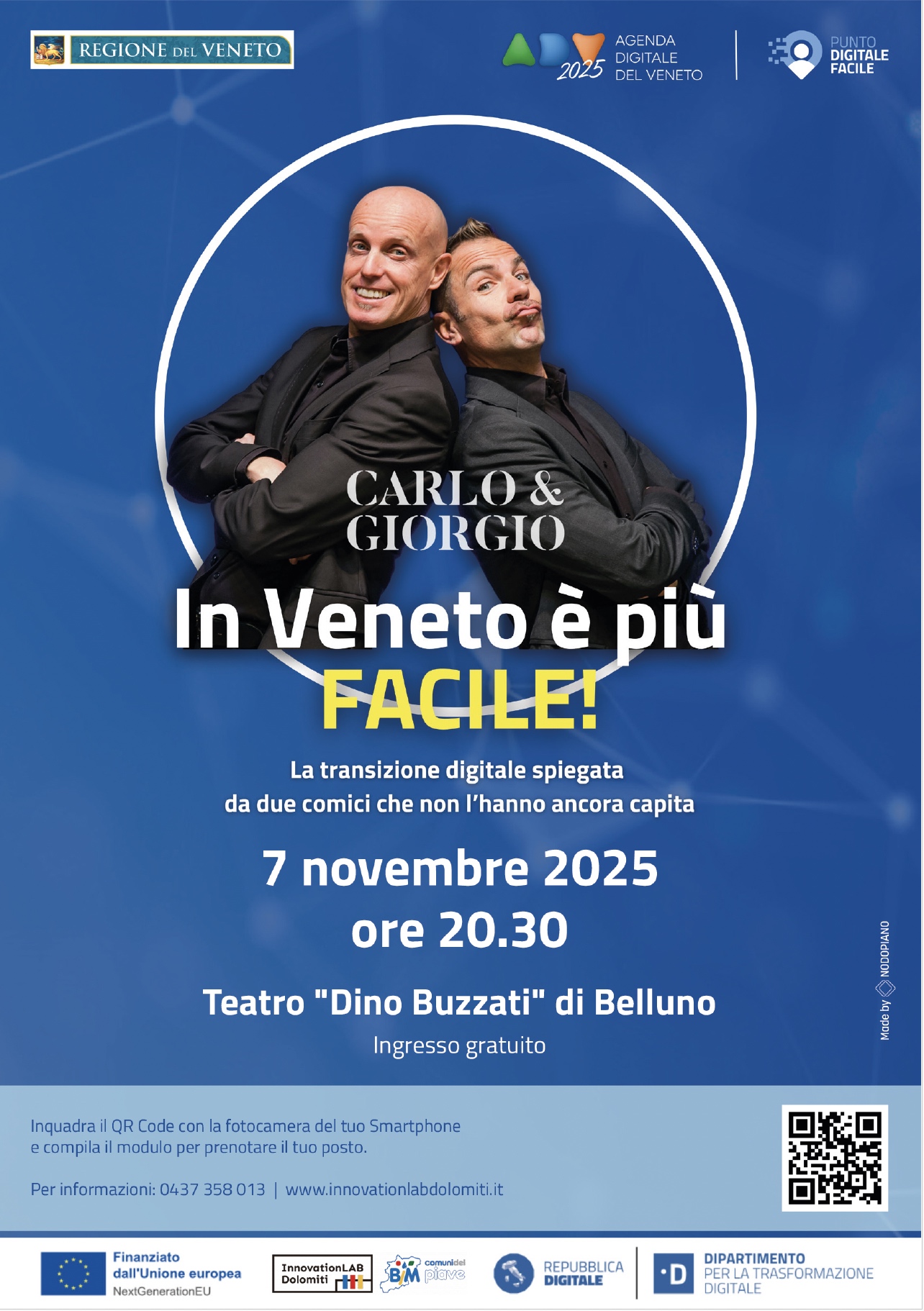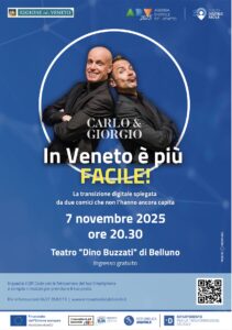 BELLUNO Il Consorzio BIM Belluno Piave invita il pubblico venerdì alle 20.30 al Teatro “Dino Buzzati” per “In Veneto è più FACILE!”, spettacolo gratuito con il duo comico Carlo & Giorgio. I due artisti veneziani racconteranno con leggerezza e ironia la transizione digitale e il suo impatto sulla vita quotidiana di cittadini e imprese. L’iniziativa rientra nel programma del Punto Digitale Facile e dell’Agenda Digitale del Veneto 2025, con l’obiettivo di rendere i servizi online più accessibili e promuovere la cittadinanza digitale. Carlo & Giorgio, da oltre venticinque anni protagonisti della scena comica veneta, uniscono tradizione e attualità in uno spettacolo coinvolgente e intelligente. La partecipazione è gratuita, ma è richiesta la prenotazione del posto, possibile tramite link o QR Code indicati nella locandina. Per informazioni: 0437 358013.