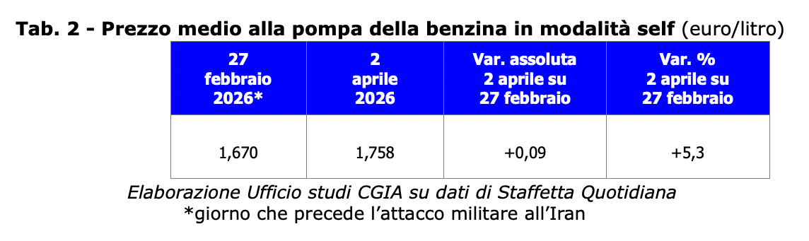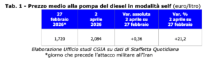 Al netto del taglio delle accise approvato dal governo Meloni il 18 marzo scorso e prorogato ieri sempre dal nostro esecutivo fino al prossimo 1 maggio, il prezzo medio del diesel in modalità self in poco più di un mese di guerra in Medio Oriente è passato da 1,720 euro/litro a 2,084 (+21,2 per cento) (vedi Tab. 1) e quello della benzina da 1,670 euro/litro a 1,758 (+5,3 per cento) (vedi Tab. 2). L’impennata del prezzo alla pompa del gasolio per autotrazione è stata trascinata dalla quotazione del Brent che sempre nello stesso periodo è “esplosa” addirittura del 54,1 per cento (vedi Graf. 1).