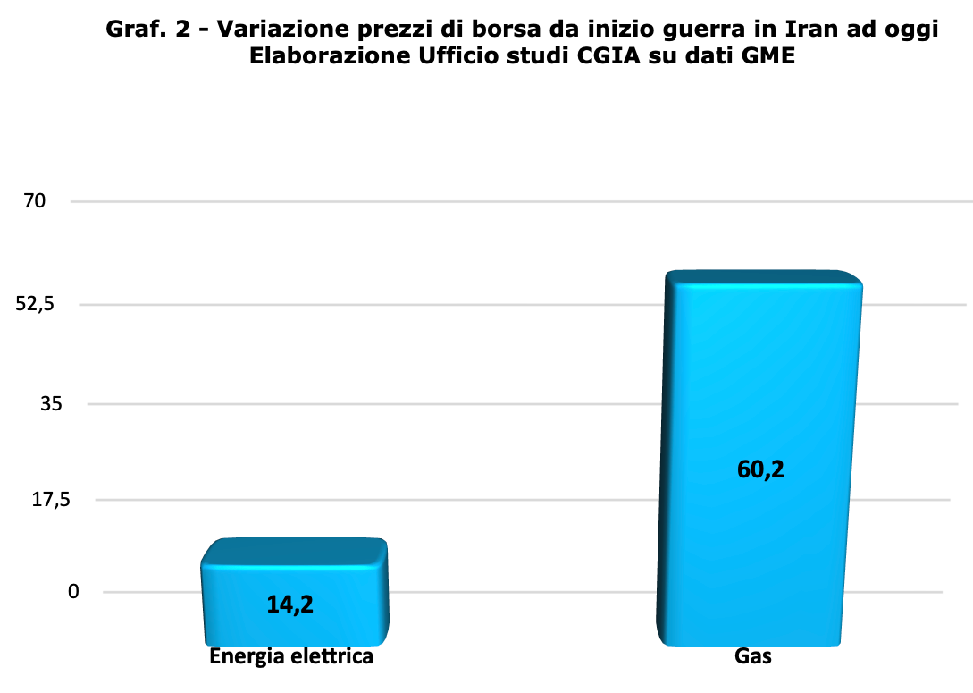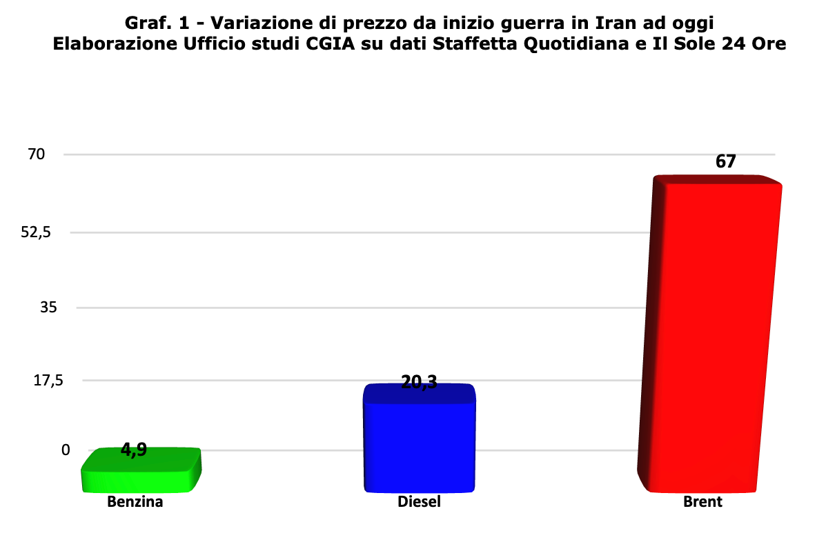 Dall’inizio della guerra in Iran, le quotazioni del gas (+60,2%) e del Brent (+54,1%) sono aumentate sensibilmente, facendo salire rispettivamente le bollette elettriche (+14,2%) e il costo del diesel (+21,2%).