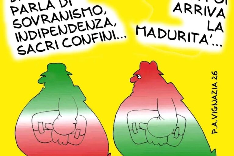 ++ Eccola qui la vignetta di Pieraldo Vignazia “VIP”: semplice nel tratto, chirurgica nel messaggio. Due figure-Italia, panciute, identiche, solo con la sfumatura cromatica invertita. Stesso atteggiamento, stesso passo, stessa valigetta. Il testo a metà fra la confessione e l’autoironia, colpisce subito: “Uno da giovane parla di sovranismo, indipendenza, sacri confini… ma poi arriva la…