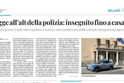 ** DI MIRKO MEZZACASA Inseguimento nel primo pomeriggio di ieri a Belluno: un uomo non si è fermato all’alt della polizia durante un controllo stradale e ha dato il via a una fuga tra le vie cittadine. L’auto risultava sotto sequestro. La corsa si è conclusa in via Mier, dove il conducente si è barricato…