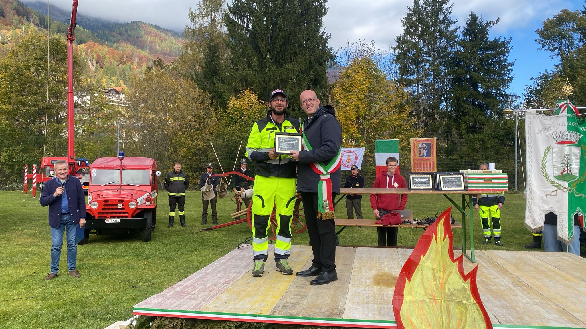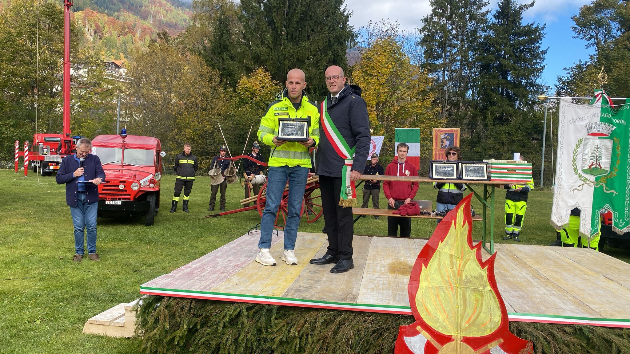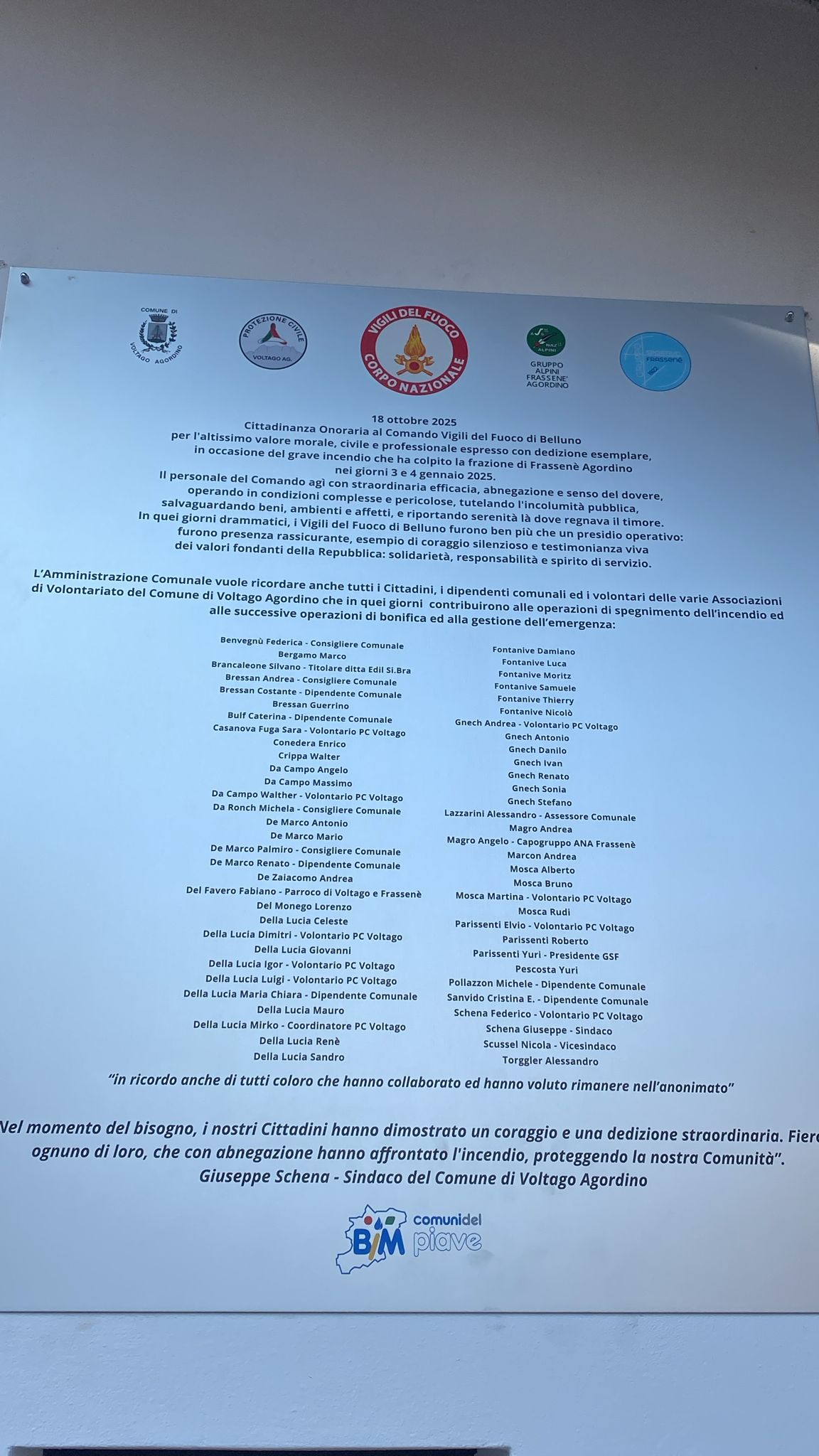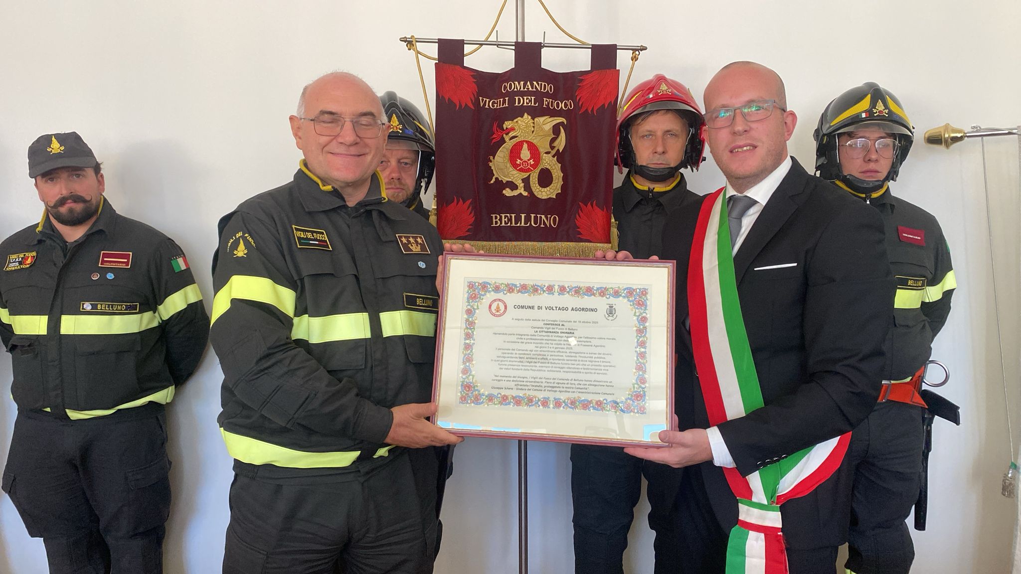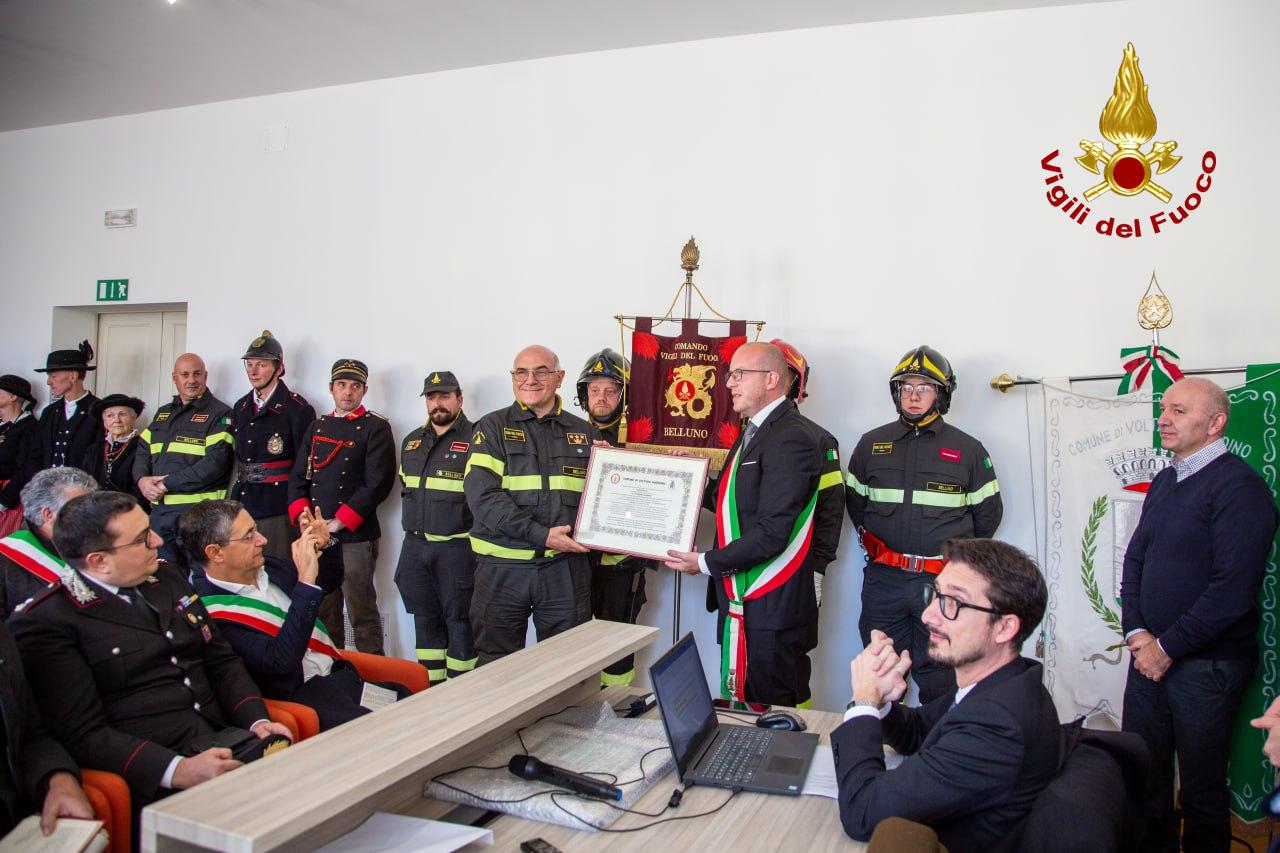 VOLTAGO Si terrà oggi la solenne cerimonia di conferimento della cittadinanza onoraria ai Vigili del Fuoco di Belluno, in segno di riconoscenza per l’eroico intervento durante il grave incendio del 3 e 4 gennaio scorsi. Il programma prevede lo scoprimento della targa commemorativa presso l’ex sede Pro Loco, ora presidio antincendio, alla presenza del Sindaco Giuseppe Schena e delle principali autorità civili, militari e religiose. Seguiranno la sfilata dei mezzi di soccorso, l’alzabandiera con l’inno nazionale e i ringraziamenti ufficiali ai distaccamenti, ai volontari e ai cittadini che contribuirono alle operazioni d’emergenza.