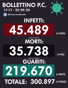 22 SETTEMBRE INFETTI + 410 MORTI + 14 GUARITI + 967
