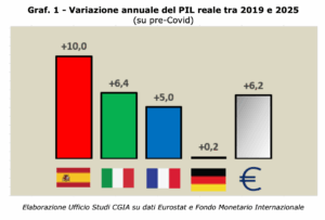 Rispetto all’anno pre-Covid (2019), il Veneto ha aumentato il proprio Pil del 5,1 per cento. Tra i vari lockdown che si sono susseguiti nel 2020/2021, i contraccolpi negativi provocati dalla pandemia, l’impennata dell’inflazione, lo scoppio della guerra tra Russia e Ucraina e il caro energia, sono stati sei anni difficilissimi che, però, il Veneto e in generale il nostro Paese hanno superato meglio di quasi tutti i nostri principali competitor commerciali. Se tra il 2019 e il 2025 il Pil reale italiano è aumentato del 6,4 per cento, in Francia è salito del 5 e in Germania dello 0,2. Solo la Spagna può contare su una variazione positiva superiore alla nostra che ha raggiunto il 10 per cento. La media dei paesi dell’Area dell’Euro si è attestata al +6,2 per cento (vedi Graf. 1). A segnalarlo è l’Ufficio studi della CGIA.