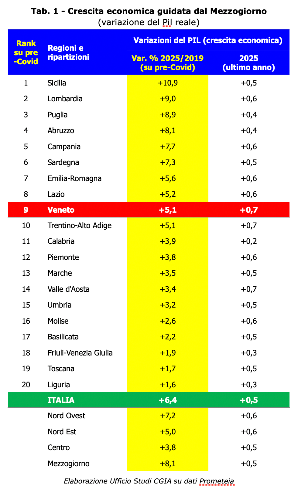 l’ottimo risultato comunque ottenuto in questo sessennio è ascrivibile, in particolare, all’andamento delle costruzioni, del turismo e dell’industria. Tutto il Paese e in particolare il Veneto hanno potuto beneficiare dagli effetti “innescati” dal Superbonus e dal PNRR. Un ruolo importante è stato giocato anche dai consumi delle famiglie che hanno potuto contare su 300 miliardi di aiuti che i governi Conte II, Draghi e Meloni hanno erogato a livello nazionale a famiglie e imprese tra il 2020 e il 2023. Risorse che hanno anestetizzato i danni provocati dall’emergenza pandemica. Subito dopo la Sicilia, scorgiamo la Lombardia con il +9 per cento, la Puglia con il +8,9, l’Abruzzo con il +8,1 e la Campania con il +7,7. Il Veneto, come dicevamo più sopra, si colloca al nono posto a livello nazionale con una variazione di crescita del +5,1 per cento. Tra le quattro ripartizioni geografiche presenti in Italia, il Mezzogiorno indossa la “maglia rosa”, grazie a una crescita dell’8,1 per cento. Seguono il Nordovest con il +7,2, il Nordest con il +5 e, infine, il Centro con il +3,8 (vedi Tab. 1).