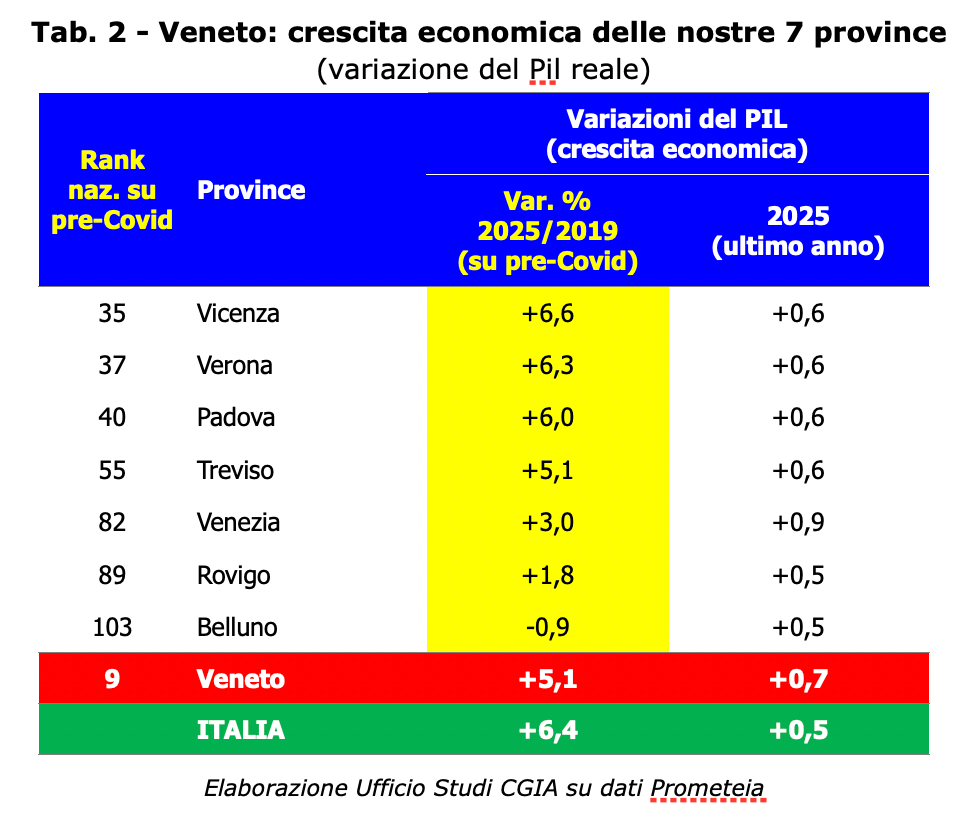 Se spostiamo l’analisi a livello provinciale veneto, nel periodo 2019/2025 è Vicenza ad aver registrato la ripresa economica più sostenuta (+6,6 per cento). Seguono Verona (+6,3) e Padova (+6). Assieme ad altre sette province italiane, Belluno (-0,9 per cento) non ha ancora recuperato il terreno perso rispetto al periodo pre-pandemico (vedi Tab. 2).