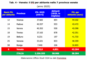 Se, in linea di massima, dall’analisi del trend di crescita 2019-2025 e 2024-2025 le aree del Mezzogiorno hanno registrato le crescite più importanti, per quanto concerne la ricchezza pro capite relativa al 2025 le distanze rimangono ancora molto significative. Se a Nordovest il Pil per abitante è pari a 46.817 euro e nel Nordest a 44.211 euro, nel Mezzogiorno si attesta a 25.637 (vedi Tab. 3). La provincia veneta più ricca è Vicenza che conta un Pil per abitante pari a 44.102 euro. Seguono Padova (43.472 euro) e Verona (43.390 euro). La più “povera” è Rovigo (32.855 euro). La media della nostra regione è di 42.264 euro, mentre quella nazionale di 38.304 euro (vedi Tab. 4).