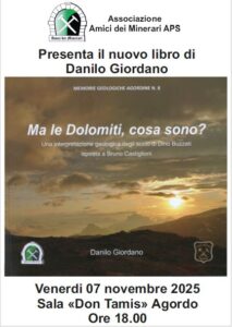 AGORDO L’Associazione Amici dei Minerari APS invita il pubblico alla presentazione del nuovo libro di Danilo Giordano, intitolato “Ma le Dolomiti, cosa sono? Una interpretazione geologica degli scritti di Dino Buzzati ispirata a Bruno Castiglioni”. L’evento si terrà venerdì 7 novembre 2025 alle ore 18 presso la Sala «Don Tamis» di Agordo. L’opera, ottavo volume della collana Memorie Geologiche Agordine, propone un affascinante viaggio tra scienza e letteratura, esplorando le Dolomiti attraverso lo sguardo poetico di Dino Buzzati e l’approccio scientifico di Bruno Castiglioni. Giordano intreccia geologia e narrativa, restituendo al lettore una visione unica delle montagne patrimonio dell’umanità.