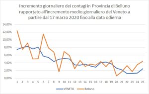 I dati dei contagi odierni , riportano l’incremento giornaliero per la Provincia di Belluno che è uno tra i più alti del Veneto. La provincia di Belluno resta con il rapporto contagi-popolazione tra i più alti tra le Province Venete, dopo Padova e Verona e ben al di sopra di Treviso, Vicenza, Venezia e Rovigo e si sta, giorno dopo giorno, avvicinando sempre più a Padova
