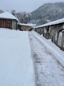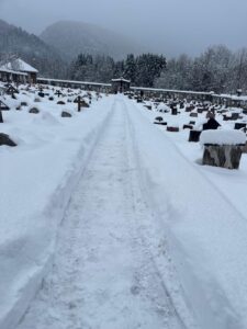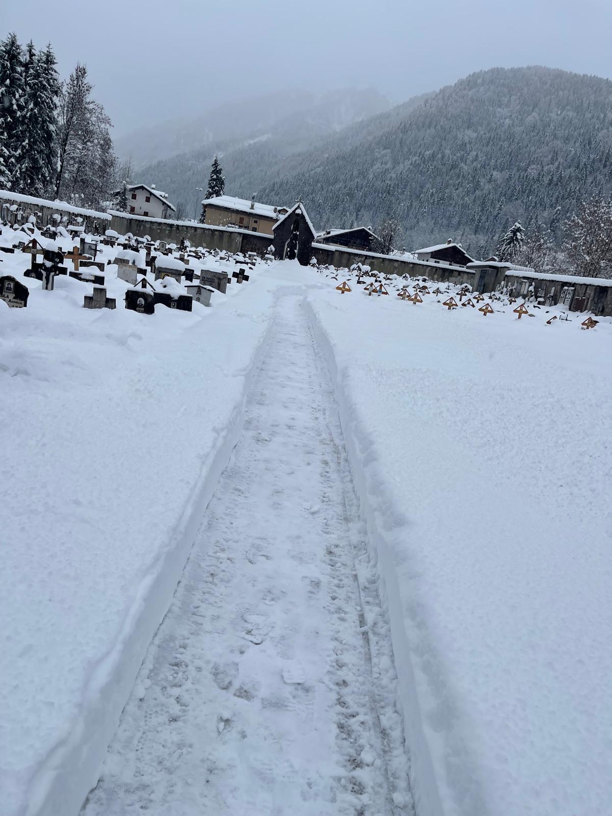 C’è un sentiero che attraversa il silenzio. È stretto, pulito con cura, scavato nella neve alta che copre ogni cosa. Ai lati, le croci e le lapidi riposano sotto una coltre bianca. Eppure quel cammino è vivo. È il segno concreto di una presenza. Quel sentiero porta la firma – discreta ma preziosa – di Elio Tancon, per tutti Elio della Norma, dal nome della moglie. Un volontario di quelli veri. Di quelli che non fanno rumore, ma fanno la differenza. Quando l’inverno decide di farsi sentire, quando la neve impera e rende difficile anche un passo, Elio non si tira indietro ed ecco un corridoio sicuro, permette a figli, nipoti, amici di raggiungere i propri cari. Non è solo neve spalata: è rispetto. È memoria resa accessibile. In quelle immagini si vede più di un vialetto pulito. Si vede un gesto di comunità.