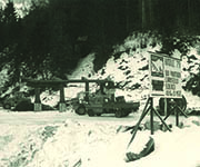 Primo cartello sul ponte Zunaia dove sorgerà la partenza della Seggiovia Alleghe-Coi (1979)