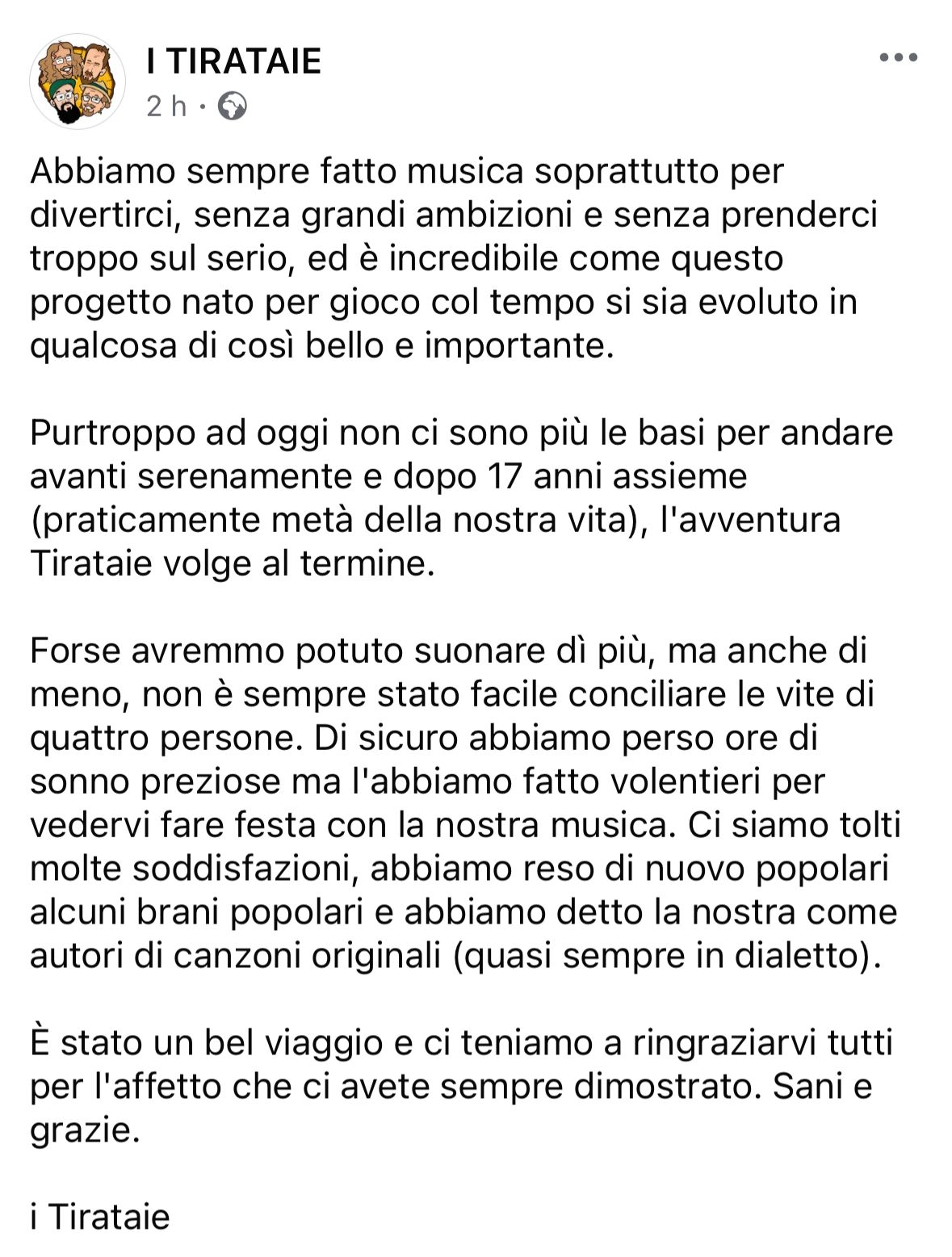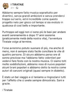 Cominciarono la loro avventura musicale proprio 17 anni fa così per gioco con la voglia di divertirsi con la musica e fu una lunga lunga avventura fatta di tanta allegria e successi. Sono loro, “I Tirataie”, gruppo folk ladino dell’Agordino. L’annuncio ufficiale sul loro profilo Facebook il 30 novembre 2025, con tanti messaggi di affetto da tutti i loro fans, con la speranza di poterli rivedere un giorno risuonare insieme.