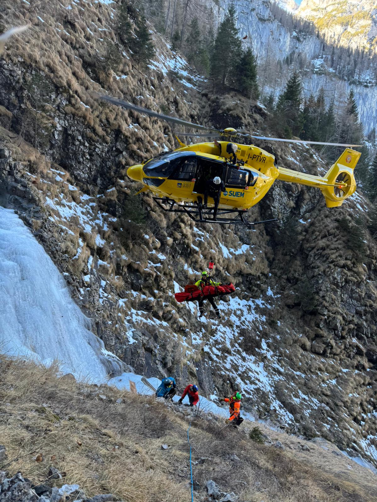 VALLE DI GARES Questa mattina verso le 10.30 la Centrale del 118 è stata contattata dal compagno di un alpinista che era caduto in prossimità di una cascata di ghiaccio in Val di Gares, a Canale d’Agordo. Il 36enne austriaco si trovava con l’amico alla base della cascata Tre per Tre, che i due si stavano preparando a scalare, quando era scivolato, ruzzolando per un’ottantina di metri tra le balze gelate. Due volontari del Soccorso alpino di Belluno, che si trovavano casualmente sul posto, lo hanno raggiunto e gli hanno prestato prima assistenza, mentre si avvicinava Falco 2 e la Stazione della Val Biois predisponeva l’intervento di suo personale a Capanna Comelle per eventuale supporto. Una volta individuato il luogo dell’incidente, l’elicottero ha sbarcato con un verricello di 20 metri il tecnico di elisoccorso, che ha messo in sicurezza il luogo attrezzando una sosta, e il medico e l’infermiere, che hanno provveduto a stabilizzare l’infortunato a seguito di un sospetto trauma al bacino e altre contusioni. Imbarellato e issato a bordo con l’aiuto dei due soccorritori, l’uomo è stato trasportato all’ospedale di Treviso.