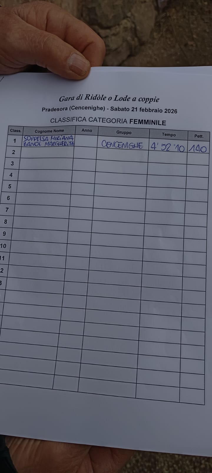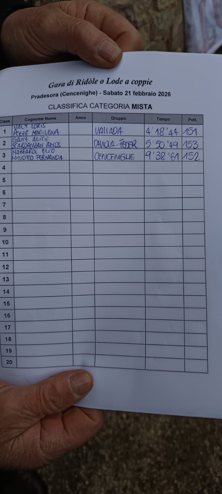 CENCENIGHE Due su due per Erwin Lazzarini e Andrea Soppelsa. La coppia di Cencenighe trionfa nella gara delle lode 2026 di Cencenighe organizzata ottimamente dal locale gruppo dei donatori del sangue e dai numerosi volontari. Secondo successo consecutivo per loro in quest’inverno 2026 dopo la prima vittoria ottenuta sul tracciato storico di Colmean di Canale D’Agordo. Lazzarini – Soppelsa, partiti con il pettorale numero uno e forse favoriti da un tracciato non ancora segnato dalle discese degli altri concorrenti, hanno saputo interpretare al meglio la gara lunga 1300 metri che portava i piloti dall’antica località di Pradesora alla vicina Pradimezzo attraverso una strada silvo pastorale. 3’48’’73 il tempo fatto segnare all’arrivo dalla coppia vincitrice. Sul podio insieme a loro si piazzano in seconda posizione Marco e Nico Scardanzan staccati di 10 secondi. Medaglia di bronzo per Giampaolo e Simone De Biasio. La categoria mista ha visto ai nastri di partenza tre coppie. Prima classificata la coppia Loris Valt e Pezzè Marilena di Vallada con il tempo di 4’18’’44 Secondo posto per il tandem Amos Scardanzan e Ganz Alice. Terza posizione per la coppia di Cencenighe formata da Elio Mazzarol e Fernanda Minotto. Nella categoria femminile ha vinto la coppia formata da Margherita Zanol e Miriana Soppelsa. 20 gli equipaggi in gara che hanno vita ad un pomeriggio di sport e divertimento. I donatori del sangue di Cencenighe ringraziano tutti i volontari e quelli che hanno dato una mano alla riuscita della manifestaizone. Una bella iniziativa con lo scopo di sensibilizzare più persone possibili su un azione importante come quella di donare il sangue.