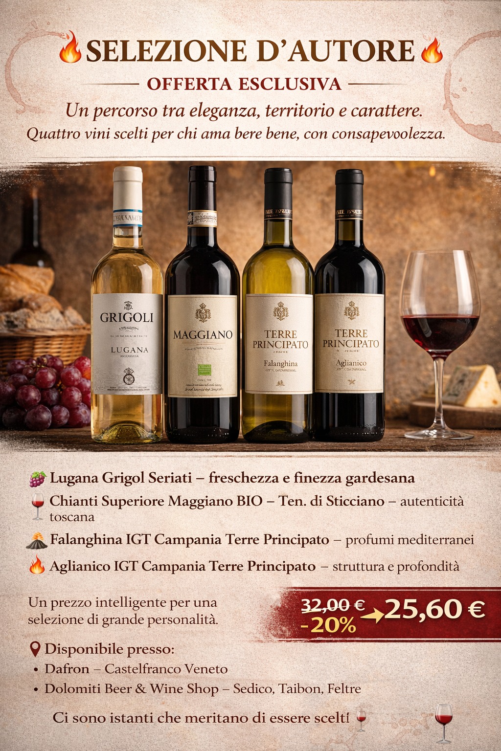 Un saluto agli ascoltatori di Radio Più. Questa settimana nelle enoteche Dafrom e Dolomiti Beer & Wine Shop proponiamo una selezione di quattro bianchi francesi che raccontano freschezza, eleganza e carattere. Dal Mediterraneo il Clarisse Piquemal, solare e fruttato; da Bordeaux il Château Platon Blanc, pulito e agrumato; dalla Loira il Château de Pont – Touraine Sauvignon Blanc, aromatico e vibrante; dal Languedoc Le Penchant, moderno e avvolgente. Il pacchetto completo è in offerta a 33,90 euro invece di 43,50 fino al 15 febbraio. E, restando in tema, diciamo solo questo: se lo dicesse Crozza… probabilmente aggiungerebbe anche “sentiamo cosa ne pensa Mirko di Radio Più”. Noi invece vi diciamo semplicemente: stappiamo qualcosa di buono. Ricordiamo la nostra visione: ogni persona bevitrice merita di essere ascoltata, rispettata e accompagnata nella scelta giusta. Vi aspettiamo a Castelfranco Veneto, Sedico, Feltre e Taibon. Parola di Gianluca.