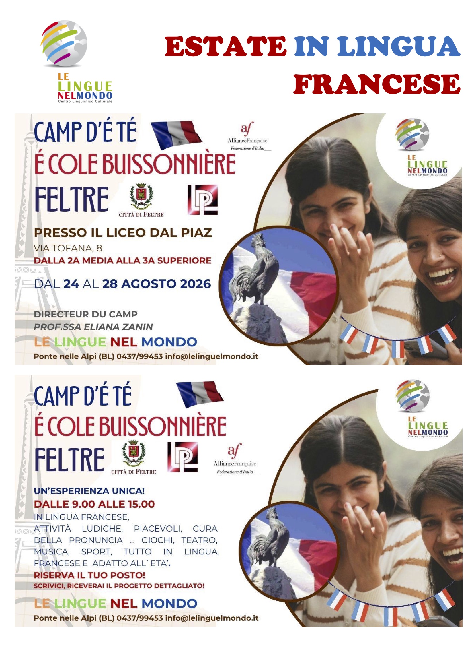 FELTRE Un’immersione totale nella lingua e nella cultura francese, senza banchi né lezioni frontali, ma attraverso teatro, gioco e attività all’aria aperta. È questa la proposta del Camp d’été École Buissonnière, il centro estivo in lingua francese che si terrà dal 24 al 28 agosto al Liceo Dal Piaz, nella sede succursale di via Tofana.