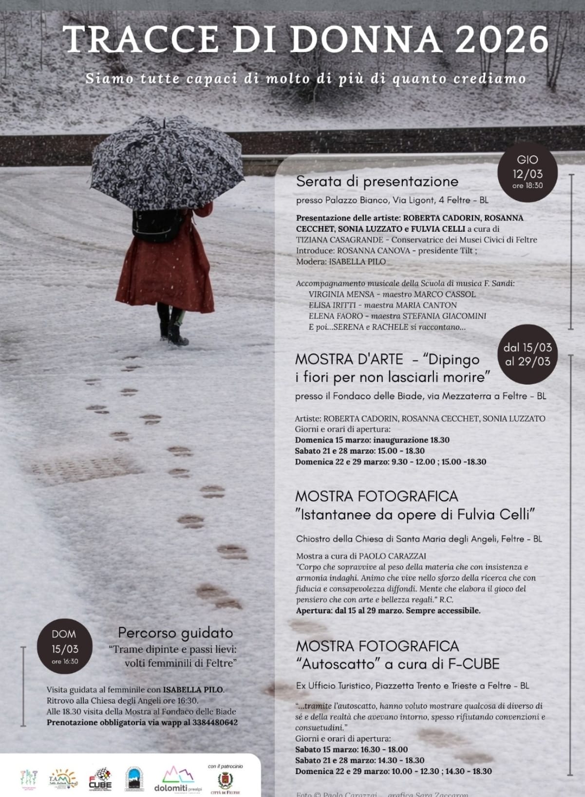 Tracce di Donna 2026 si sviluppa su più luoghi della città e diversi linguaggi artistici. Giovedì 12 marzo, ore 18:30 – Presentazione a Palazzo Bianco, via Ligont 4, Feltre. Introduzione di Rosanna Canova, interventi delle artiste Roberta Cadorin, Rosanna Cecchet, Sonia Luzzato e Fulvia Celli, a cura di Tiziana Casagrande, conservatrice dei Musei Civici di Feltre, con moderazione di Isabella Pilo. Accompagnamento musicale della Scuola di Musica Francesco Sandi con le allieve Virginia Mensa, Elisa Iritti, Elena Faoro, e le testimonianze di Serena e Rachele. Domenica 15 marzo, ore 16:30 – Visita guidata “Trame dipinte e passi lievi, volti femminili di Feltre”, ritrovo alla Chiesa degli Angeli, con visita alla mostra al Fondaco delle Biade alle 18:30 (prenotazione obbligatoria). Dal 15 al 29 marzo – Mostra d’arte “Dipingo i fiori per non lasciarli morire” presso il Fondaco delle Biade, via Mezzaterra, Feltre. Inaugurazione domenica 15 marzo alle 18:30. Aperture nei weekend: sabato 21 e 28 marzo, 15:00–18:30; domenica 22 e 29 marzo, 9:30–12:00 e 15:00–18:30. Dal 15 al 29 marzo – Mostra fotografica istantanea delle opere di Fulvia Celli presso il chiostro della Chiesa di Santa Maria degli Angeli. A cura di Paolo Ferrassa, l’esposizione esplora il corpo, l’animo e il pensiero artistico dell’artista. Accesso sempre disponibile. Dal 15 al 29 marzo – Mostra fotografica “Autoscatto” a cura di F‑CUBE presso l’ex Ufficio Turistico, Piazzetta 33, Feltre. Orari: sabato 15 marzo, 16:30–18:00; sabato 21 e 28 marzo, 14:30–18:30; domenica 22 e 29 marzo, 10:00–12:30 e 14:30–18:00.