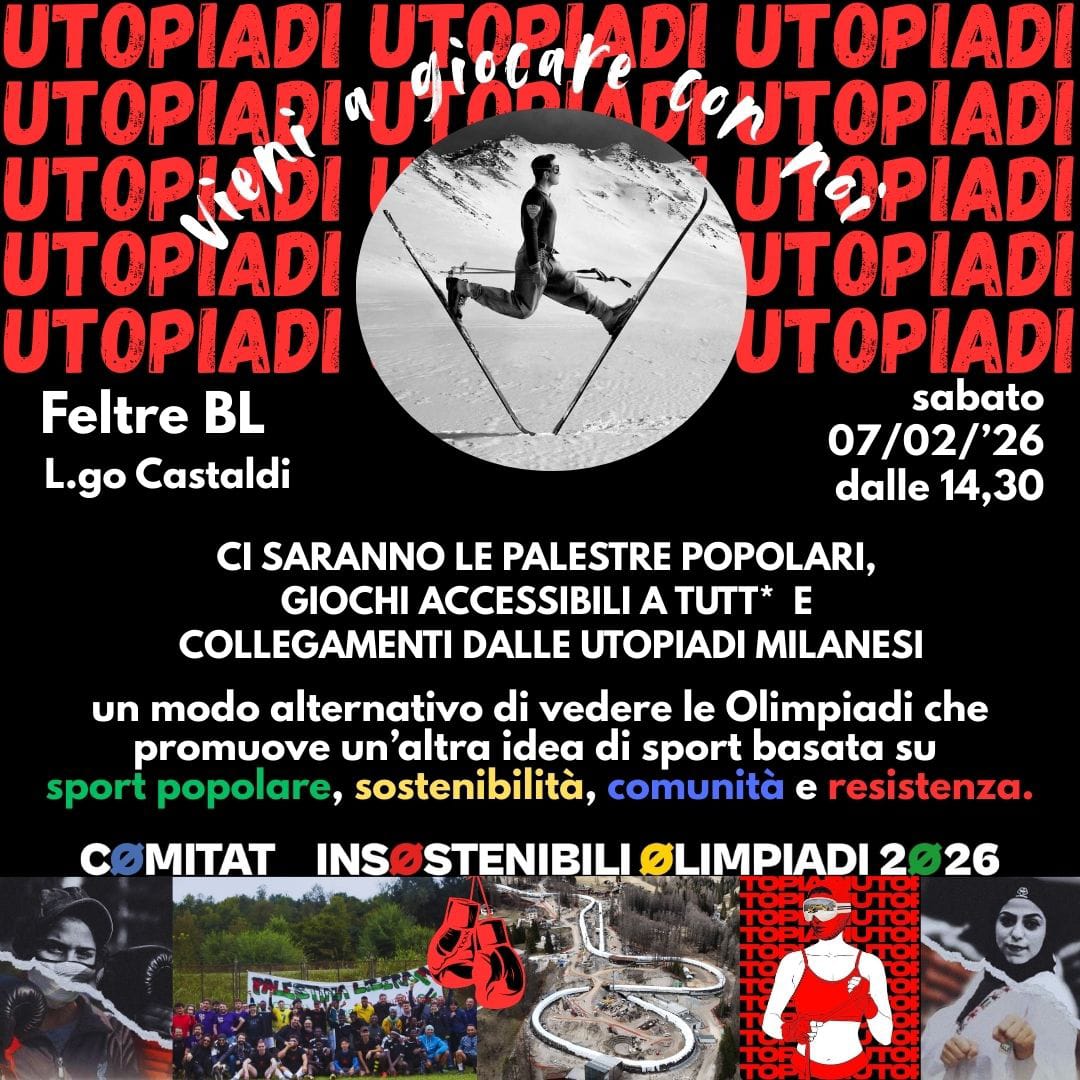 FELTRE Sabato 7 febbraio, a partire dalle ore 14.30, Piazza Vittorino da Feltre (Piazza Isola) ospiterà un pomeriggio di sport popolare e attività collettive aperte a tutte le età, nell’ambito dell’iniziativa “Da Milano a Feltre, insieme per le Utopiadi”. L’evento si svolgerà in concomitanza con le giornate di apertura delle Olimpiadi Milano-Cortina 2026 e prevede momenti di socialità, attività sportive e riflessioni su temi legati al territorio e all’organizzazione dell’evento olimpico. Saranno presenti musica e interventi pubblici dedicati a vari aspetti sociali, tra cui trasporti, scuola, sanità, lavoro e ambiente. Organizzatori e partecipanti invitano la cittadinanza a prendere parte all’iniziativa, che si propone come occasione di incontro e condivisione di esperienze legate allo sport e alla vita comunitaria. Benedetto Calderone tra i rappresentanti del Comitato Insostenibili Olimpiadi, “C.I.O.” ha dichiarato: “Un evento che non nasce in contrasto con lo spirito olimpico, ma piuttosto con le Olimpiadi delle élite che non sono di tutti, men che meno del territorio che le ospita”. Il comitato sottolinea le sue ragioni: “Nella narrazione mainstream dovevano essere Olimpiadi a costo zero, non dovevano avere un impatto ambientale, dovevano essere dei giochi popolari e partecipati ma invece non è stato così. Per questo motivo poteremo in piazza in maniera goliardica gli sport quali basket, pallavolo, ping pong, calcetto balilla, birilli, boxe, ovvero dei giochi aperti a tutti per mostrare il vero spirito popolare che si è decantato. Sottolineo che come comitato non siamo contro le Olimpiadi e lo sport in generale. Contestiamo in particolare la presenza di Israele, una nazione, secondo il nostro comitato genocidaria, e che non rispetta i valori di fratellanza dei giochi olimpici. Approfondiremo anche il piano economico delle Olimpiadi Milano Cortina 2026 che non sono a costo zero e fino a questo momento ci sono costate 6 miliardi. Sottolineeremo il grande impatto ambientale perché per la realizzazione delle opere sono stati abbattuti alberi e c’è un allarme PFAS per tutto il cemento spostato.”