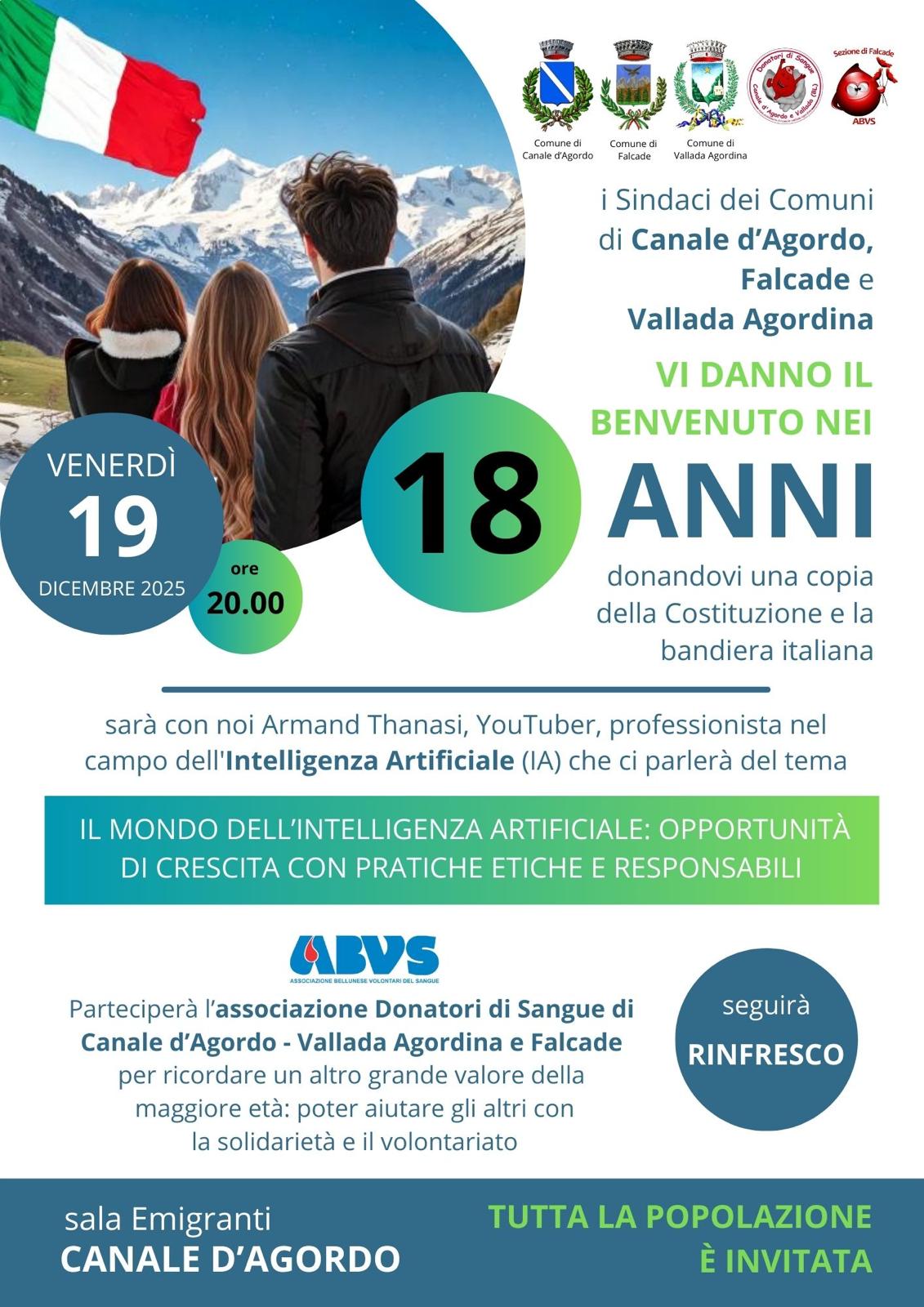 CANALE D’AGORDO Venerdì 19 dicembre, alle ore 20.00, nella Sala Emigranti di Canale d’Agordo, le Amministrazioni Comunali della Valle del Biois celebreranno i concittadini che hanno raggiunto la maggiore età. L’iniziativa, ormai una tradizione consolidata, è realizzata con la collaborazione delle sezioni donatori di sangue di Canale-Vallada e, da quest’anno, anche del Comune di Falcade e della locale sezione. Durante la serata i Sindaci consegneranno ai giovani una copia della Costituzione italiana e la bandiera tricolore, simboli di diritti e responsabilità civiche. I rappresentanti delle sezioni donatori illustreranno inoltre il valore della solidarietà, del volontariato e della donazione del sangue. L’evento sarà arricchito dall’intervento di Armand Thanasi, YouTuber ed esperto di Intelligenza Artificiale, che affronterà il tema delle opportunità e delle pratiche etiche nell’uso dell’IA. L’incontro è aperto a tutta la cittadinanza.