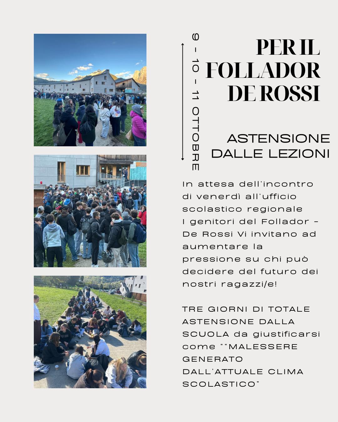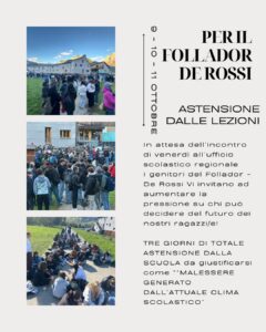 AGORDO Clima di tensione e preoccupazione all’Istituto “Follador – De Rossi” di Agordo, dove i genitori hanno invitato gli studenti a tre giorni di astensione totale dalle lezioni, dal 9 all’11 ottobre, in segno di protesta contro la situazione che da settimane coinvolge la scuola. Nel volantino diffuso sui canali social e nei gruppi di genitori si legge l’appello a “aumentare la pressione su chi può decidere del futuro dei nostri ragazzi e ragazze”, in attesa dell’incontro fissato per venerdì presso l’Ufficio scolastico regionale. La protesta, spiegano i promotori, nasce dal “malessere generato dall’attuale clima scolastico”, che si è aggravato nelle ultime settimane a causa di tensioni interne e di incertezze legate alla gestione dell’istituto. Gli studenti sono invitati a giustificare l’assenza con questa motivazione. L’obiettivo, sottolineano i genitori, non è quello di creare disagi, ma di richiamare l’attenzione delle autorità competenti affinché venga trovata una soluzione stabile e condivisa per il buon funzionamento dell’istituto. L’incontro con i rappresentanti dell’Ufficio scolastico regionale, sarà dunque decisivo per capire se la protesta porterà risultati concreti o se la mobilitazione proseguirà nelle prossime settimane.