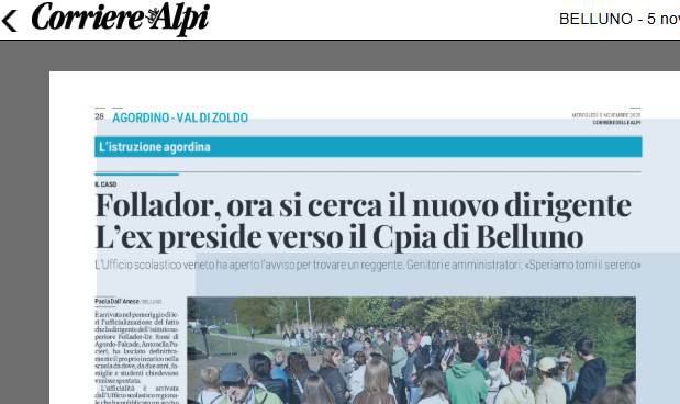 AGORDO Nella rassegna stampa delle 8 del mattino, l’approfondimento: arrivano le novità dal Follador di Agordo. Con grave ritardo, le istituzioni sono finalmente intervenute: Antonella Paceri non è più la dirigente dell’Istituto Follador, e sarà destinata a dirigere una scuola serale. Una vicenda lunga e tormentata. I primi venti di tempesta si erano alzati nel marzo dello scorso anno, e da allora si sono susseguiti mesi di tensioni, proteste, manifestazioni e articoli di denuncia sui media locali e regionali. Una situazione che ha provocato danni d’immagine e credibilità a uno dei più prestigiosi istituti scolastici della provincia di Belluno. Molti si chiedono ora perché ci sia voluto così tanto per intervenire e chi debba rispondere dei ritardi che hanno esasperato una comunità intera. A gennaio, con le pre-iscrizioni, si capirà se questa crisi avrà lasciato ferite profonde anche nei numeri. ANCHE OGGI SUL Dal Corriere delle Alpi a firma di Paola Dall’Anese la pagina speciale