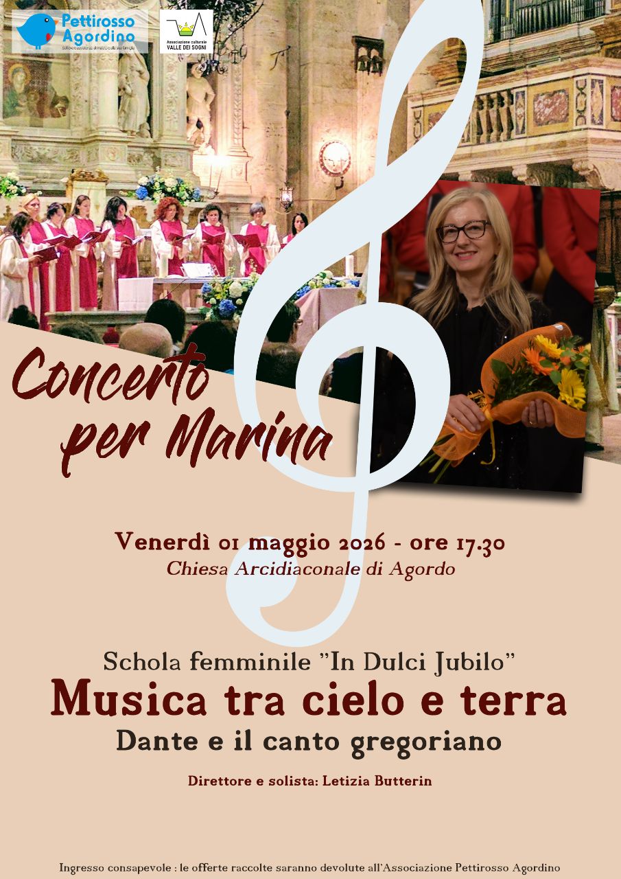 AGORDO Anche quest’anno l’Associazione Valle dei Sogni di Col di Prà ha organizzato un concerto in memoria di Marina Nessenzia, musicista e insegnante di Agordo, figura molto amata nel territorio. L’evento vedrà la partecipazione della Schola femminile “In dulci Jubilo” di Verona, coro al quale la stessa Marina aveva appartenuto per molti anni, mantenendo un forte legame artistico e umano. Il concerto, intitolato “MUSICA TRA CIELO E TERRA. Dante e il canto gregoriano”, propone l’esecuzione dei brani citati nella Divina Commedia, alternati alla lettura dei versi del Sommo Poeta, in un intreccio tra musica e letteratura. L’appuntamento è fissato per venerdì 1 maggio alle ore 17.30 nella chiesa Arcidiaconale di Agordo. Le offerte raccolte saranno devolute all’associazione Pettirosso Agordino.