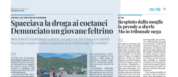 FELTRE Controlli straordinari dei Carabinieri nel Feltrino con tre denunce e due segnalazioni per droga, a conferma dell’alta attenzione sul territorio di Feltre e dintorni. L’operazione della Compagnia locale ha interessato centri urbani, periferie e luoghi di ritrovo giovanile per prevenire illegalità e degrado. Il Nucleo Operativo e Radiomobile ha denunciato un giovane per detenzione ai fini di spaccio dopo aver accertato la cessione di stupefacenti a coetanei; nella perquisizione sono stati sequestrati hashish, bilancino di precisione e materiale per il confezionamento. Controlli mirati anche a Borgo Valbelluna, in località Lentiai, dove un ragazzo è stato trovato con sette grammi di marijuana ed è stato segnalato, mentre un altro è stato denunciato per porto abusivo di un coltello a scatto di 19 centimetri. A Trichiana un soggetto è stato segnalato come assuntore. Infine, a Sedico un uomo ai domiciliari è stato denunciato per evasione.