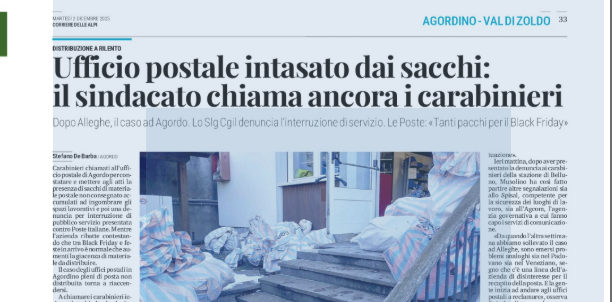 AGORDO Gli uffici postali di Agordo e Alleghe sono al centro di una denuncia formale per interruzione di pubblico servizio, presentata da Adriano Musolino, funzionario sindacale della CGIL Belluno. La carenza cronica di personale addetto al recapito, secondo Musolino, ha provocato l’accumulo di decine di chili di corrispondenza e pacchi non consegnati, fino a 100 chili al giorno, creando problemi di sicurezza nei locali e disagi per i cittadini. Nei giorni scorsi sono stati effettuati sopralluoghi con rilievi fotografici e Musolino ha chiamato i Carabinieri ad Agordo, come già fatto ad Alleghe, affinché siano testimoni diretti della situazione. La criticità si accentua durante ferie e malattie, quando non viene inviato personale sostitutivo. Musolino annuncia inoltre una segnalazione allo Spisal per verificare le condizioni di sicurezza e ha sporto querela contro Poste Italiane S.p.A., chiedendo l’accertamento delle responsabilità e il ripristino immediato del servizio.