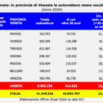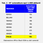 Non solo: tra i grandi Paesi dell’Unione Europea, l’Italia ha il parco auto più anziano. Quasi un’auto su quattro – il 24,3 per cento – ha più di vent’anni. Fa peggio soltanto la Spagna (25,6 per cento), mentre la Francia si ferma a poco più di una su otto (12,5 per cento) e la Germania addirittura a una su dieci (10 per cento). In Veneto, invece, il dato medio si attesta al 18,5 per cento, con punte del 21,2 a Rovigo e del 19,6 a Vicenza (vedi Tab. 4).