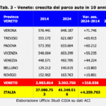 Può sembrare un controsenso, ma i numeri raccontano una storia solo in apparenza paradossale. L’Italia è il Paese europeo con la maggiore densità di automobili: circolano 701 vetture ogni mille abitanti, cioè sette auto ogni dieci persone. Il Veneto ha un dato medio in linea con quello nazionale, ma presenta 721 auto ogni 1.000 abitanti a Rovigo, 709 a Belluno, 708 a Treviso e a 706 di Vicenza. Le altre tre province – Verona (698), Padova (679) e Venezia (591) – sono al di sotto della media nazionale (vedi Tab. 1). Oltre a ciò, il numero complessivo continua a crescere. Se nel 2014 circolavano nella nostra regione 2.983.814 autovetture, nel 2024 sono salite a 3.302.750 (+319mila circa per una variazione del +10,7 per cento) (vedi Tab. 2), con punte del +12,4 per cento a Verona (+71.746) e del +11,9 a Treviso (+65.915) (vedi Tab. 3).