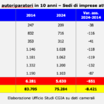 Con tante vetture, e per di più datate e bisognose di manutenzione, ci si aspetterebbe un aumento delle attività di autoriparazione (carrozzieri, autofficine, gommisti, elettrauto, etc.). Accade invece il contrario. Gli autoriparatori, in particolare quelli indipendenti, continuano a diminuire: nel 2024 le attività in Veneto erano 5.630; dieci anni prima 6.281. In pratica ne sono “scomparse” 651, con un calo del 10,4 per cento. A livello provinciale la contrazione più significativa ha interessato Belluno con il -15,4 per cento (in valore assoluto -38), Venezia con il -13,9 (-116), Rovigo con -11,6 (-41) e Treviso con -10,3 (-118) (vedi Tab. 5). Questo approfondimento è stato realizzato dall’Ufficio studi della CGIA.