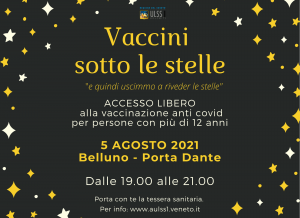 BELLUNO L’Ulss Dolomiti lancia i “Vaccini sotto le stelle” proponendo la vaccinazione anti covid in orario serale nelle piazze del territorio. Nell’ambito delle strategie per facilitare l’adesione alla campagna vaccinale, saranno organizzate delle vaccinazioni anti covid con accesso libero per persone con più di 12 anni, nelle piazze delle principali località della provincia in orario serale, dalle 19.00 alle 21.00. «Vogliamo avvicinarci in tutti i modi alle persone che ancora non hanno avuto modo di vaccinarsi. Abbiamo pensato di proporre la vaccinazione in orario serale per facilitare le persone che lavorano dando loro l’opportunità di eseguire la vaccianzione senza doversi prendere permessi dal lavoro», spiega il Direttore Generale Maria Grazia Carraro. Il primo appuntamento, promosso dall’Ulss Dolomiti in collaborazione con la Provincia di Belluno, il Comune di Belluno e i volontari del gruppo comunale di Protezione Civile, è per giovedì 5 agosto dalle 19.00 alle 21.00 a Belluno centro, presso Porta Dante. Per la vaccinazione basterà presentarsi allo stand con la tessera sanitaria Durante le vaccinazioni, vista la vicinanza con Porta Dante e in occasione dei 700 anni dalla morte del sommo poeta, saranno letti passi della Divina Commedia per allietare i presenti. Seguiranno ulteriori serate in altri punti strategici del territorio.