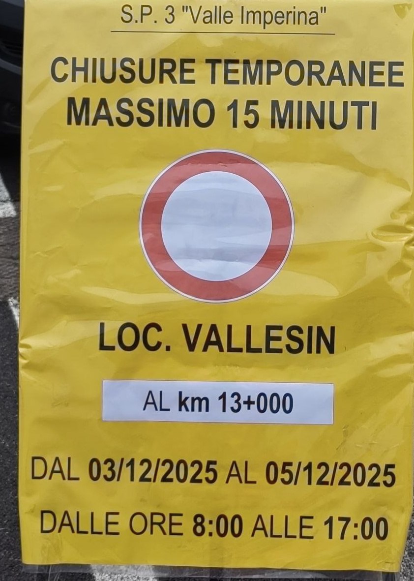 LIVINALLONGO La strada provinciale 563 di Salesei, nel tratto compreso tra Pian di Salesei e Costa di Pian, fino al 4 dicembre sarà chiusa dalle 8.00 alle 12.40 e dalle 13.40 alle 16.15, dal lunedì al venerdì.
