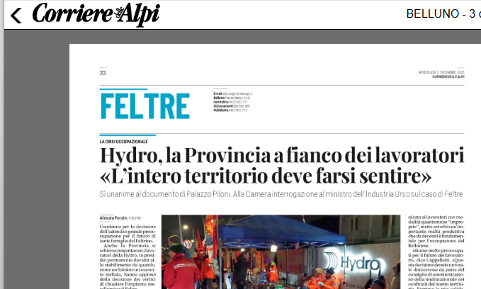 FELTRE Stamattina, alle 8.30, prenderà il via un corteo dei lavoratori e delle lavoratrici della Hydro di Feltre. La manifestazione partirà dai cancelli dell’azienda per dirigersi verso la sede di Confindustria di Feltre, dove è previsto un presidio che resterà stanziale per tutta la durata dell’incontro tra le parti. L’iniziativa nasce dalla volontà dei dipendenti di far sentire la propria voce e di richiamare l’attenzione sulle questioni aziendali che li coinvolgono direttamente. Il corteo rappresenta un momento di mobilitazione significativo, volto a sottolineare l’importanza del confronto con le istituzioni locali e con i rappresentanti imprenditoriali della città.