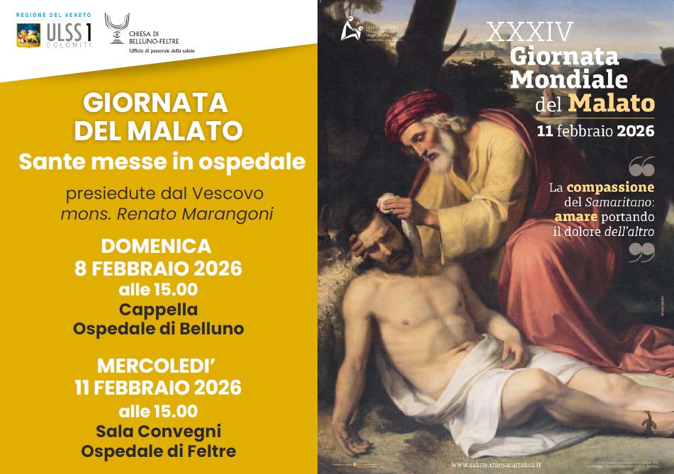 BELLUNO L’11 febbraio 2026 si celebra la Giornata Mondiale del Malato, istituita da Giovanni Paolo II e dedicata alla memoria della Beata Vergine Maria di Lourdes. L’iniziativa richiama l’attenzione sulle persone malate e su chi le assiste nei luoghi di cura e in famiglia. Per l’occasione il vescovo mons. Renato Marangoni presiederà due celebrazioni: domenica 8 febbraio alle 15 nella cappella dell’Ospedale di Belluno e mercoledì 11 febbraio alle 15 nella sala convegni dell’Ospedale di Feltre. Alle messe sono invitati pazienti, operatori sanitari e tutta la cittadinanza.