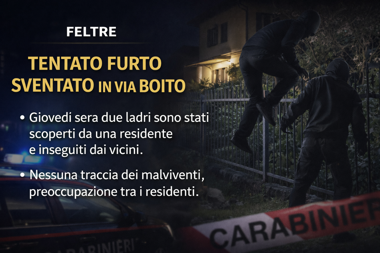FELTRE giovedì due ladri hanno tentato un furto in via Boito. Intorno alle 20.30, una residente ha notato due uomini vestiti di nero aggirarsi nei pressi di una casa: uno è riuscito a scavalcare la recinzione, ma è stato scoperto. Immediata la reazione della donna e dei vicini, che hanno dato l’allarme e inseguito i malviventi, costringendoli alla fuga verso la zona di Farra e Pedavena. Sul posto anche i carabinieri, ma dei ladri nessuna traccia. Tra i residenti cresce la preoccupazione per i ripetuti episodi nella zona.