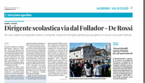 Un messaggio che segue quello di pochi giorni fa “Altri 3 studenti lasciano il Follador per iscriversi altrove, questo è l’inizio della fine di un glorioso istituto, attendiamo con timore le pre-iscrizioni” scriveva un secondo genitore.Da ieri la dirigente dell’Istituto superiore Follador–De Rossi, Antonella Pacieri, non sarebbe più alla guida della scuola. Nella prima mattinata, la preside ha riconsegnato le chiavi dell’ufficio e il computer, segnali inequivocabili di un allontanamento ufficiale. La notizia si è diffusa rapidamente tra docenti, studenti e genitori, suscitando sorpresa ma anche sollievo in una comunità scolastica che da mesi lamentava tensioni, incomprensioni e difficoltà di dialogo. La speranza, ora, è che si apra una fase di serenità e collaborazione. La decisione arriverebbe dopo le numerose segnalazioni all’Ufficio scolastico regionale, le proteste di studenti e famiglie, l’intervento della Provincia di Belluno e il ricorso al TAR firmato da 185 famiglie. Nei prossimi giorni l’Ufficio scolastico del Veneto potrebbe avviare un interpello per nominare un reggente temporaneo, vista l’assenza prolungata. Resta da capire quale sarà il futuro incarico di Pacieri, mentre molti auspicano un ritorno dell’ex preside Magalini. Per studenti e genitori, la notizia segna la possibilità di voltare pagina e restituire all’istituto il clima di dialogo e fiducia che lo ha sempre contraddistinto.