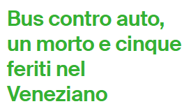 Una persona è morta e cinque sono rimaste ferite in uno scontro tra un autobus e un’automobile, avvenuto sabato a Portegrandi, frazione di Quarto D’Altino (Venezia), sulla gronda lagunare veneziana. La vittima è l’automobilista, un uomo di 60 anni. A bordo dell’autobus, dell’azienda di trasporto locale Atvo, viaggiavano circa 50 persone.