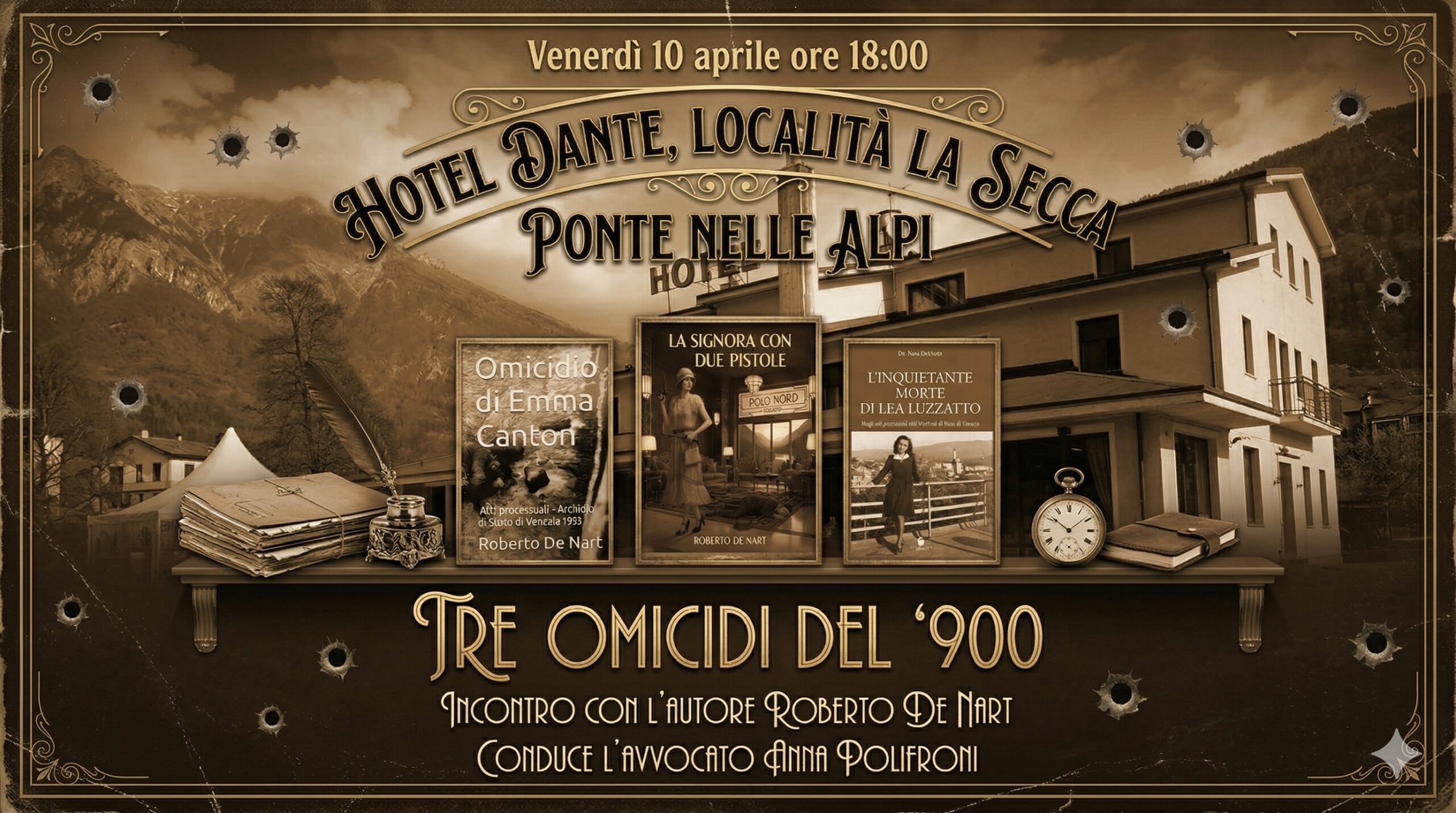 PONTE NELLE ALPI Venerdì alle 18, all’Hotel Dante, incontro con Roberto De Nart, introdotto dall’avvocato Anna Polifroni, dedicato a tre casi di omicidio avvenuti nel Bellunese nel Novecento. I libri raccontano storie intense e controverse: “La signora con due pistole” narra il delitto di Alleghe del 1922, frutto di anni di soprusi; “L’inquietante morte di Lea Luzzatto” ricostruisce il mistero della giovane professoressa trovata morta nel 1946, tra dubbi irrisolti; “Omicidio di Emma Canton” ripercorre il tragico femminicidio del 1933 a Sant’Antonio di Tortal. Le vicende, basate su documenti giudiziari e archivi storici, offrono uno spaccato drammatico e attuale della violenza e della cronaca del passato.