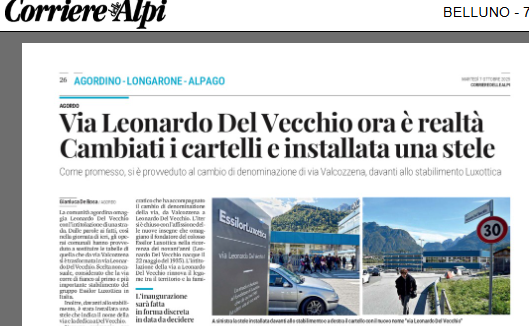 AGORDO Il Comune di Agordo nei giorni in cui si celebravano i 90 anni dalla nascita dell’mprenditore ha deciso di intitolare la strada che costeggia il primo stabilimento di Luxottica — finora nota come via Valcozzena — proprio a Leonardo Del Vecchio. Una proposta, già approvata dal Consiglio Comunale e sostenuta da EssilorLuxottica, vuole suggellare il legame profondo tra Del Vecchio e il territorio, trasformando una via industriale in un simbolo di memoria collettiva. L’intitolazione rappresenta un atto importante per il tessuto sociale e industriale dell’Agordino: un gesto che va oltre il semplice toponimo, diventando testimonianza tangibile del contributo imprenditoriale, culturale e identitario lasciato da Del Vecchio nella valle e oltre.