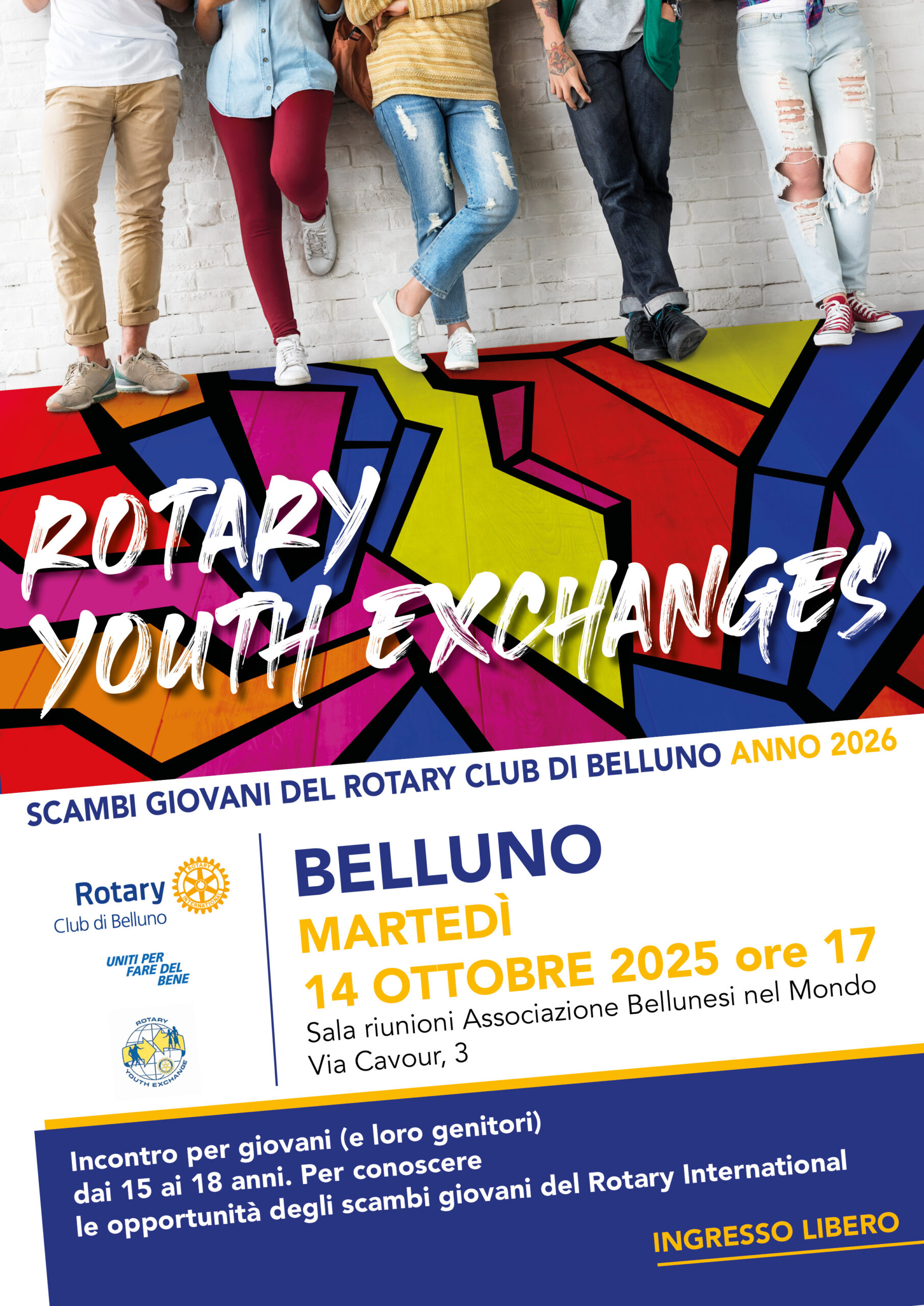 BELLUNO Il Rotary Club di Belluno invita ragazzi tra i 15 e i 18 anni e le loro famiglie all’incontro informativo sul programma Scambio Giovani, martedì 14 ottobre alle ore 17 presso la Sala Riunioni dell’Associazione Bellunesi nel Mondo in via Cavour 3. L’iniziativa illustrerà le opportunità offerte dallo scambio culturale internazionale del Rotary International, volto a promuovere comprensione e pace tra i popoli. Partecipare significa vivere un’esperienza di crescita personale, imparare nuove lingue e culture, sviluppare leadership e amicizie durature. Le famiglie devono essere disponibili ad ospitare studenti stranieri, offrendo accoglienza e sostegno. Il programma è aperto a tutti, non solo ai figli di rotariani.