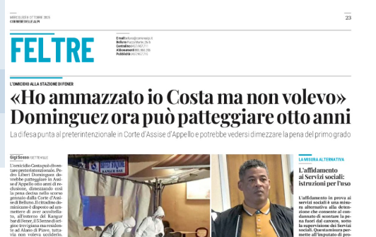 SETTEVILLE Pedro Libert Dominguez, il cittadino dominicano condannato per l’omicidio di Antonio Costa avvenuto fuori dal Kangur bar di Fener, potrebbe ottenere la riqualificazione del reato in omicidio preterintenzionale. La difesa ha chiesto di patteggiare otto anni di reclusione, la metà della pena inflitta in primo grado. La decisione arriverà il 22 ottobre in Assise d’Appello. Dominguez, in carcere dal maggio 2023, ammette l’accoltellamento ma sostiene di non aver voluto uccidere. La colluttazione era nata dopo che Costa, ubriaco e sotto effetto di cocaina, avrebbe molestato una minorenne durante una festa. Se il patteggiamento sarà accettato, l’imputato potrà poi chiedere l’affidamento ai Servizi sociali.