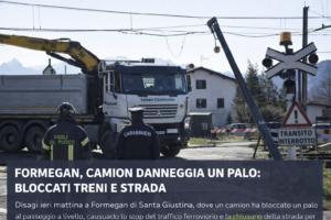 Disagi ieri mattina a Formegan di Santa Giustina, dove un camion ha danneggiato un palo al passaggio a livello, causando lo stop del traffico ferroviario e la chiusura della strada per l’intera giornata. L’incidente è avvenuto poco dopo le 10, quando il mezzo ha agganciato un cavo di sicurezza, piegando il palo di sostegno. Immediato il blocco dei treni sulla linea Belluno-Feltre e l’intervento di vigili del fuoco e carabinieri. La circolazione ferroviaria è ripresa dopo circa un’ora, mentre quella stradale è rimasta interrotta fino alla notte per consentire la sostituzione del palo danneggiato.